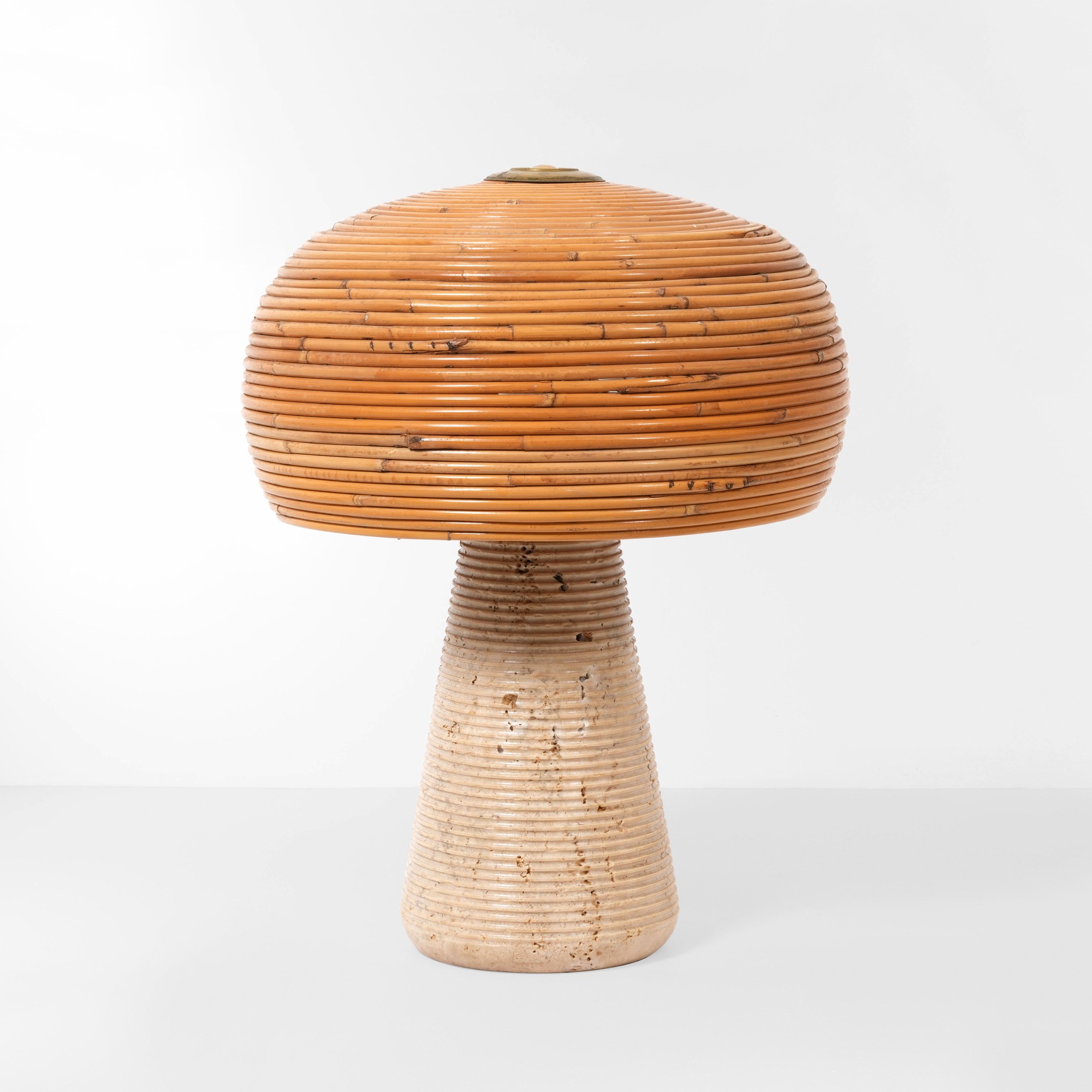 Struttura in travertino e paralume in vimini.