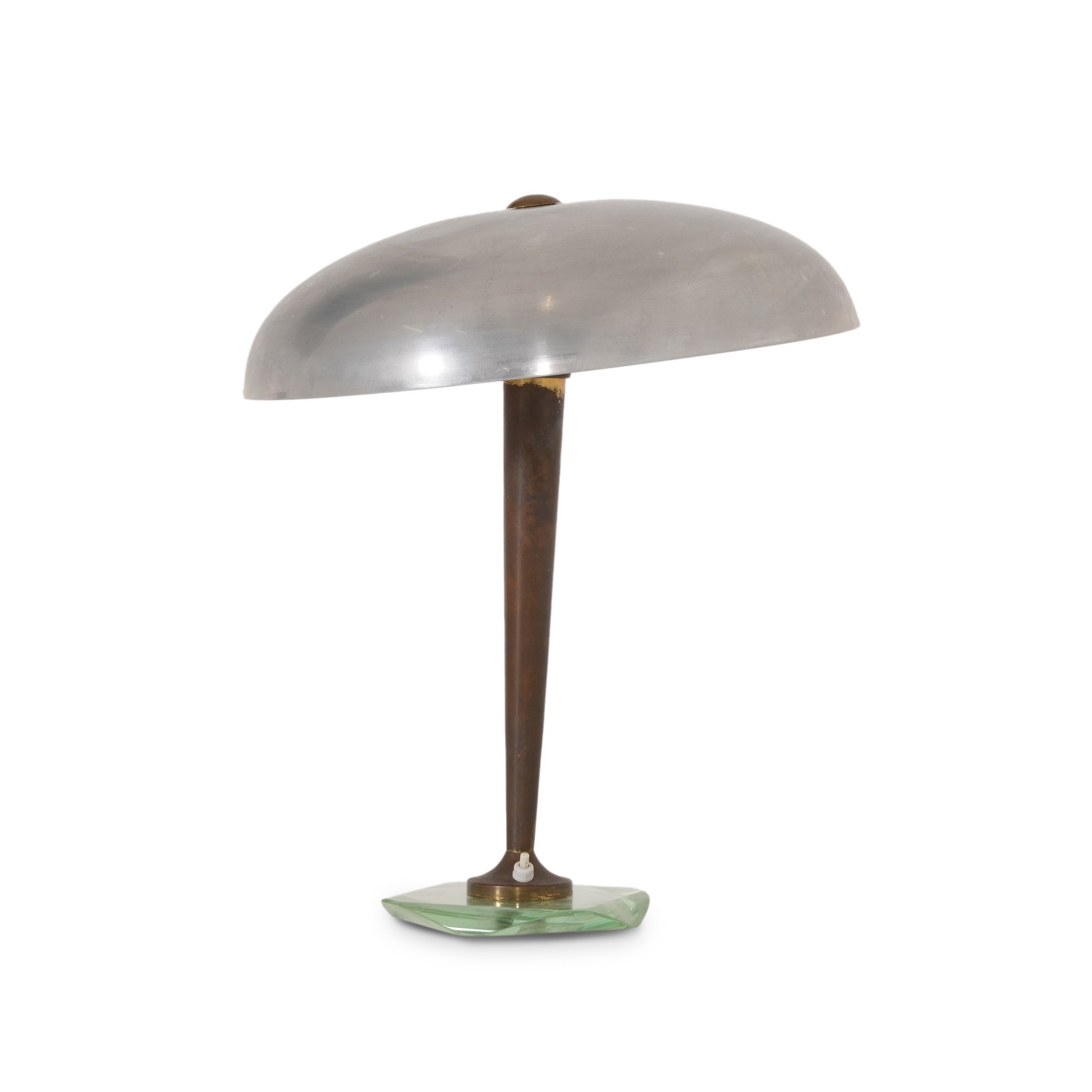 Base in vetro, struttura in ottone e paralume in metallo.