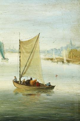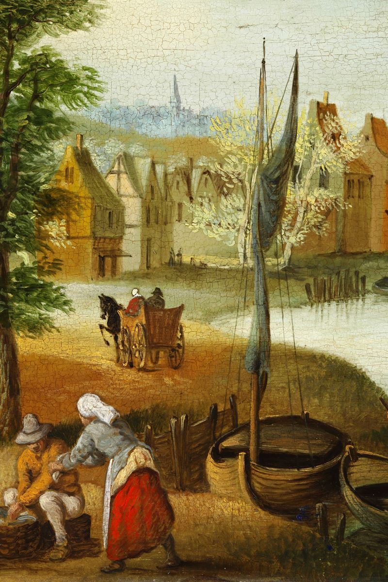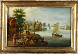 Scuola del XIX/XX secolo Paesaggio costiero con figure e imbarcazioni