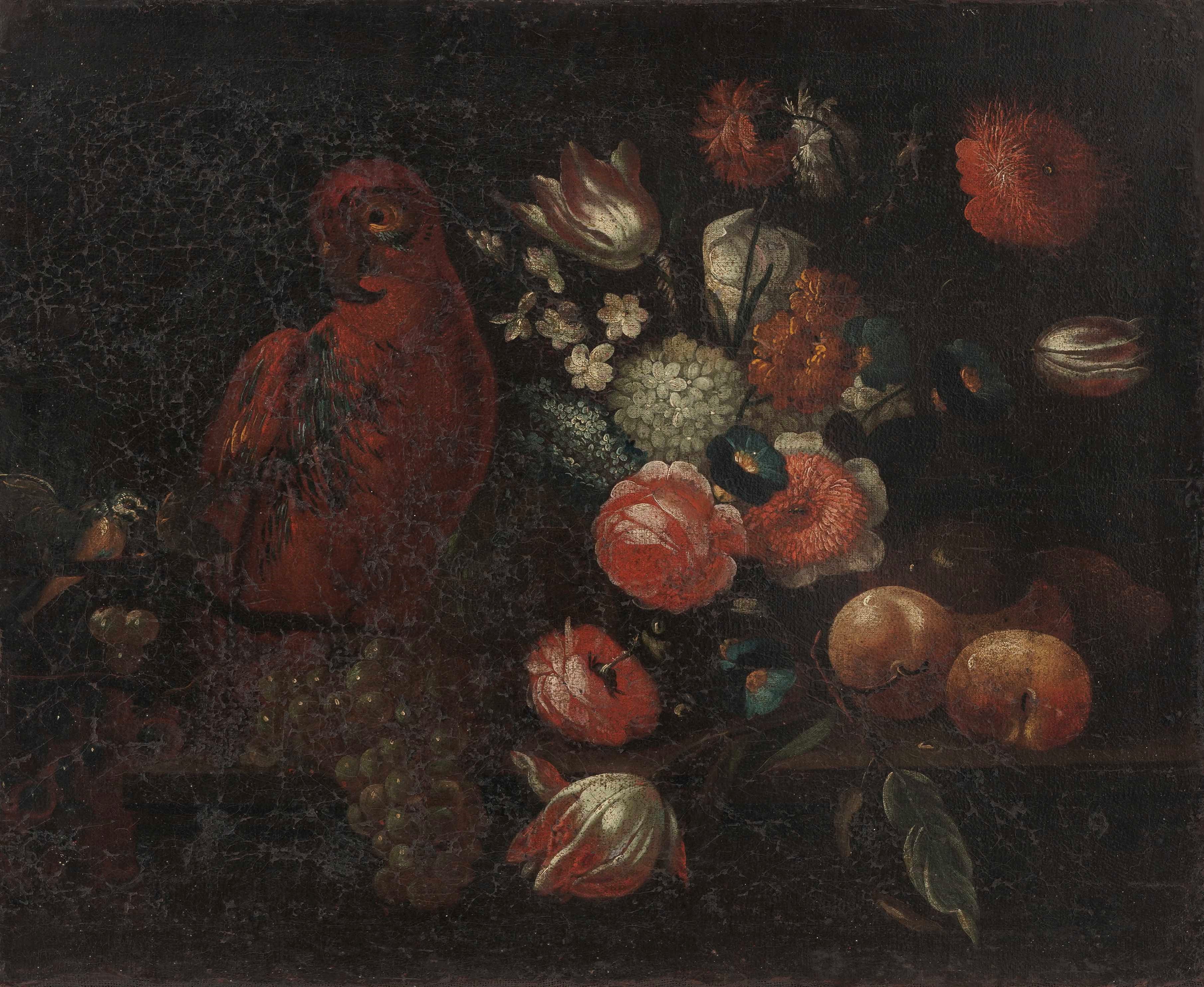 Scuola del XVIII secolo Composizione con fiori e pappagallo