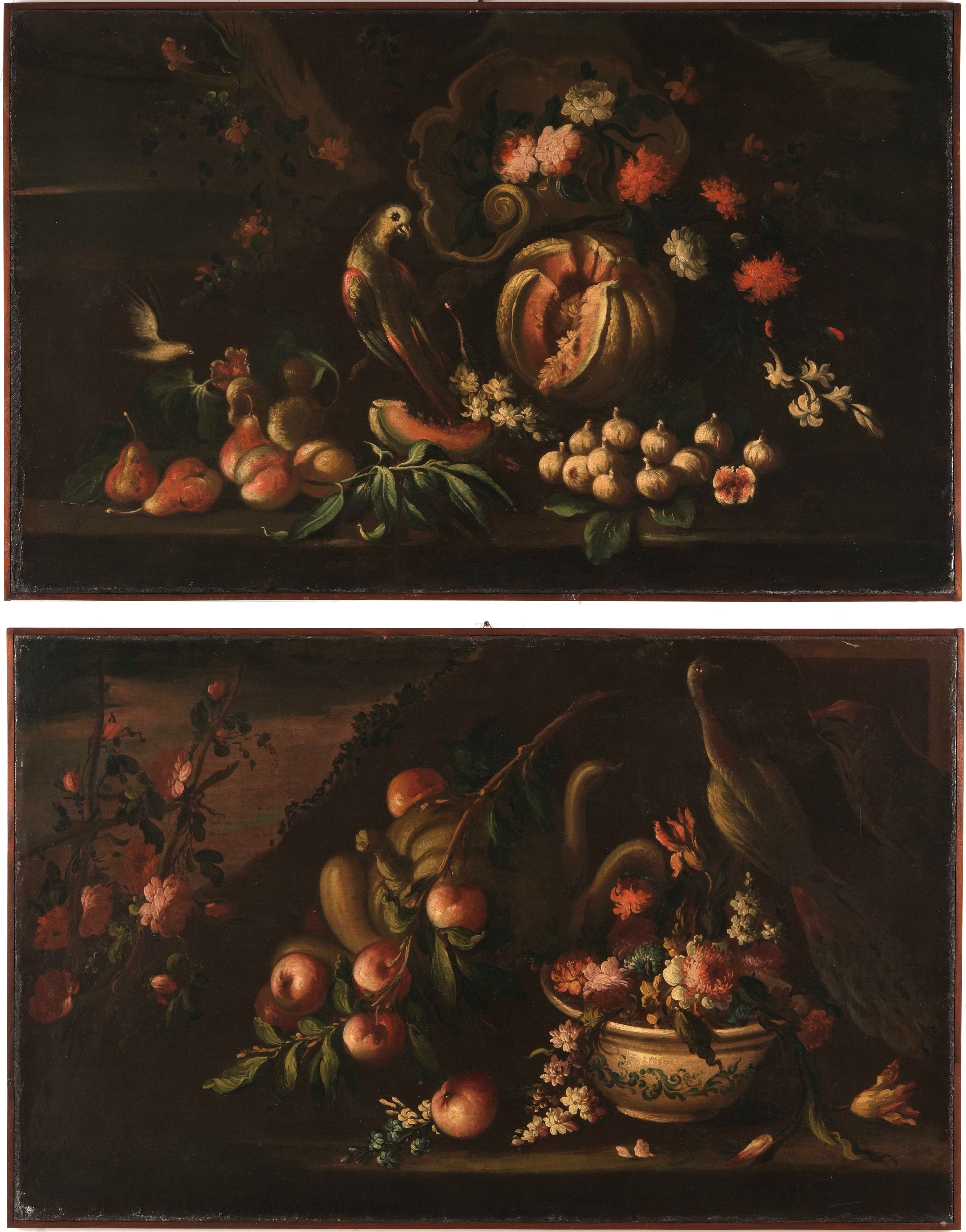 Scuola del XVIII secolo Composizioni con fiori, frutti e volatili