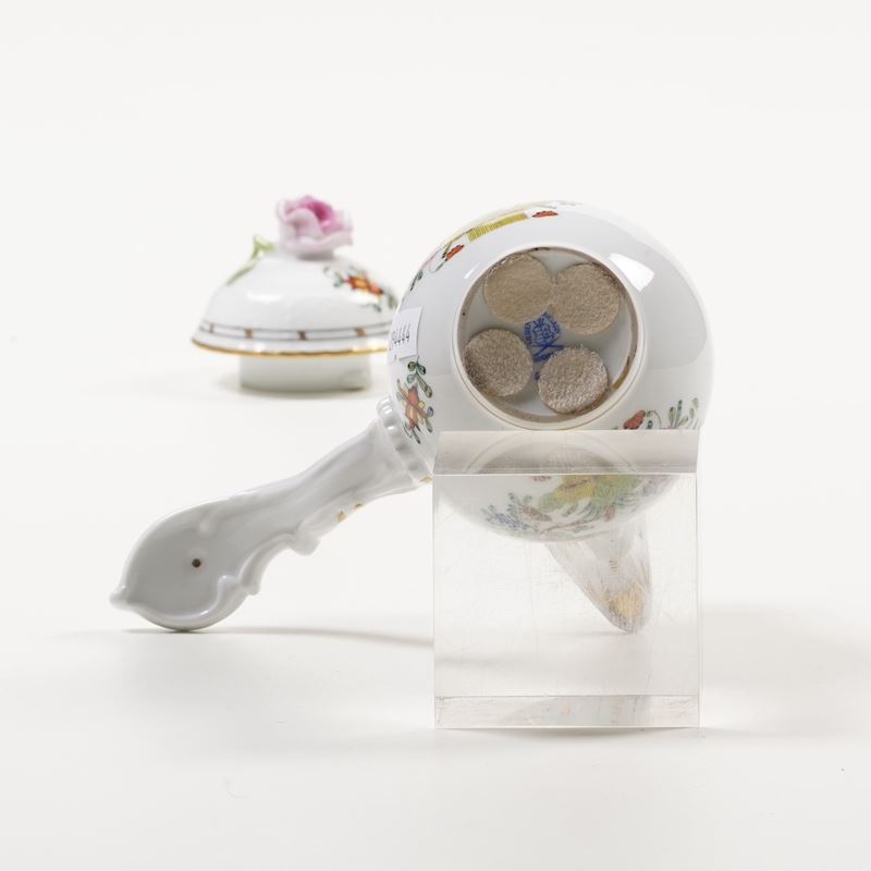 Porcellana. Marca “Herend Hungary Handpainted” con scudo in blu. Altezza senza coperchio cm 11,3. Conservazione: coperchio rotto in più frammenti