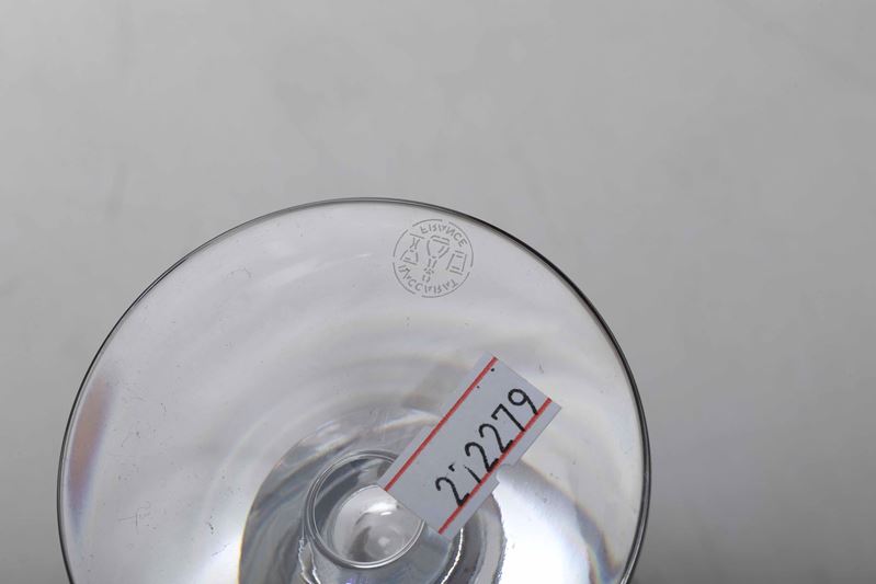 Cristallo. Marca: "Baccarat" e simbolo grafico della manifattura con "Baccarat France" incisi all'acido; qualche pezzo con etichetta cartacea "Baccarat". Dimensioni: altezza calici 13,6; tumbler cm 8,5. Conservazione: ottima.