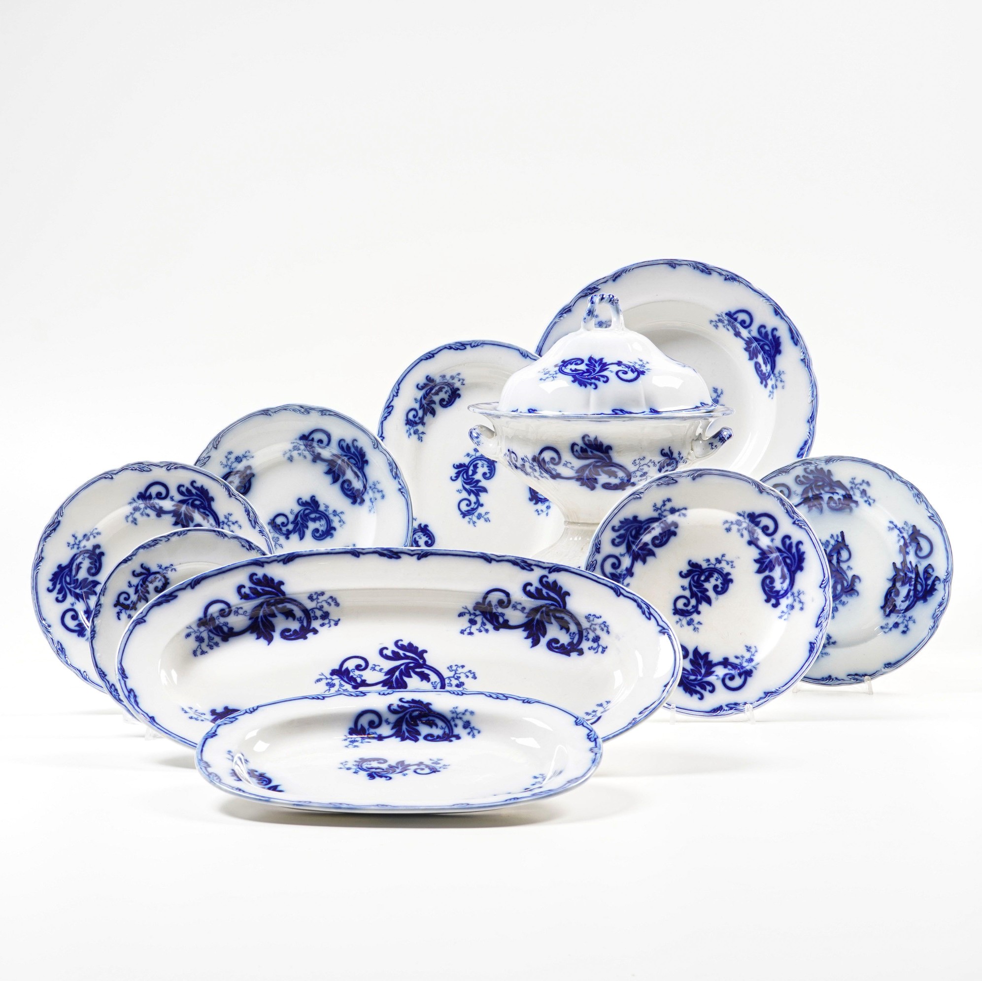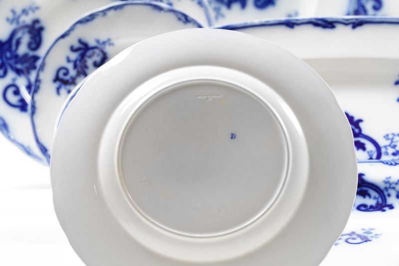 Terraglia. Marca: “Wedgwood” impresso. Conservazione: 1 sbeccatura su un piatto piano; 2 sbeccature su 2 piatti da antipasto; 1 vassoietto rotto e rincollato in più frammenti.