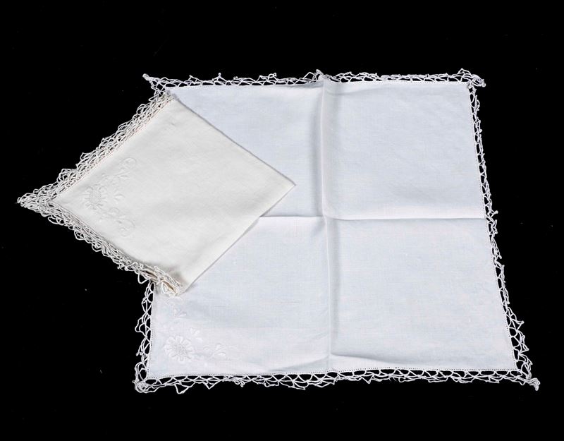 In lino riccamente decorata a mano con pizzo di Burano e ricami. Dimensioni: cm 245x220. Conservazione: buona.