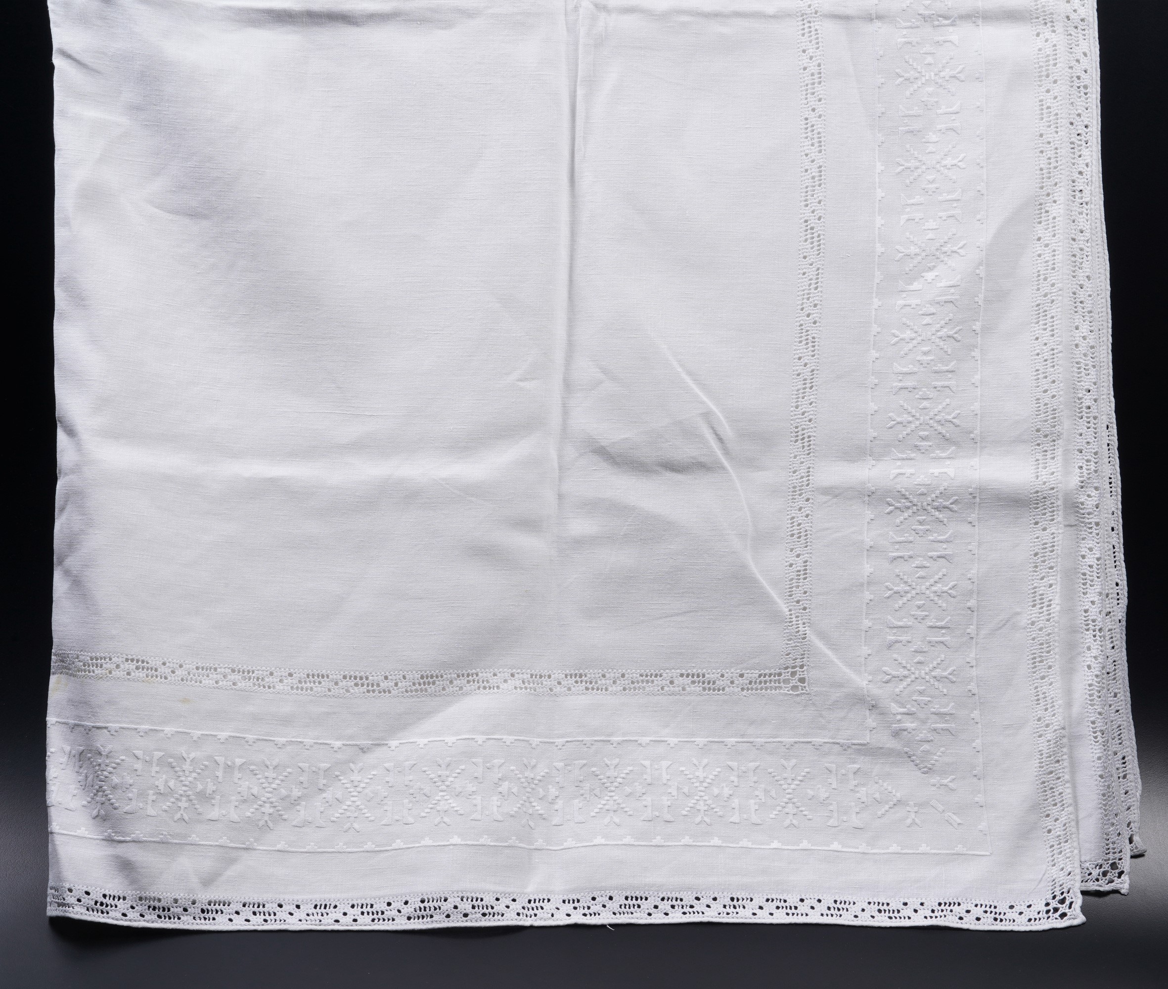 Lino e ricami filet. Dimensioni: tovaglia cm 232x271; tovagliolo cm 55,5x52,5. Conservazione: ottima; lievi macchioline brune.