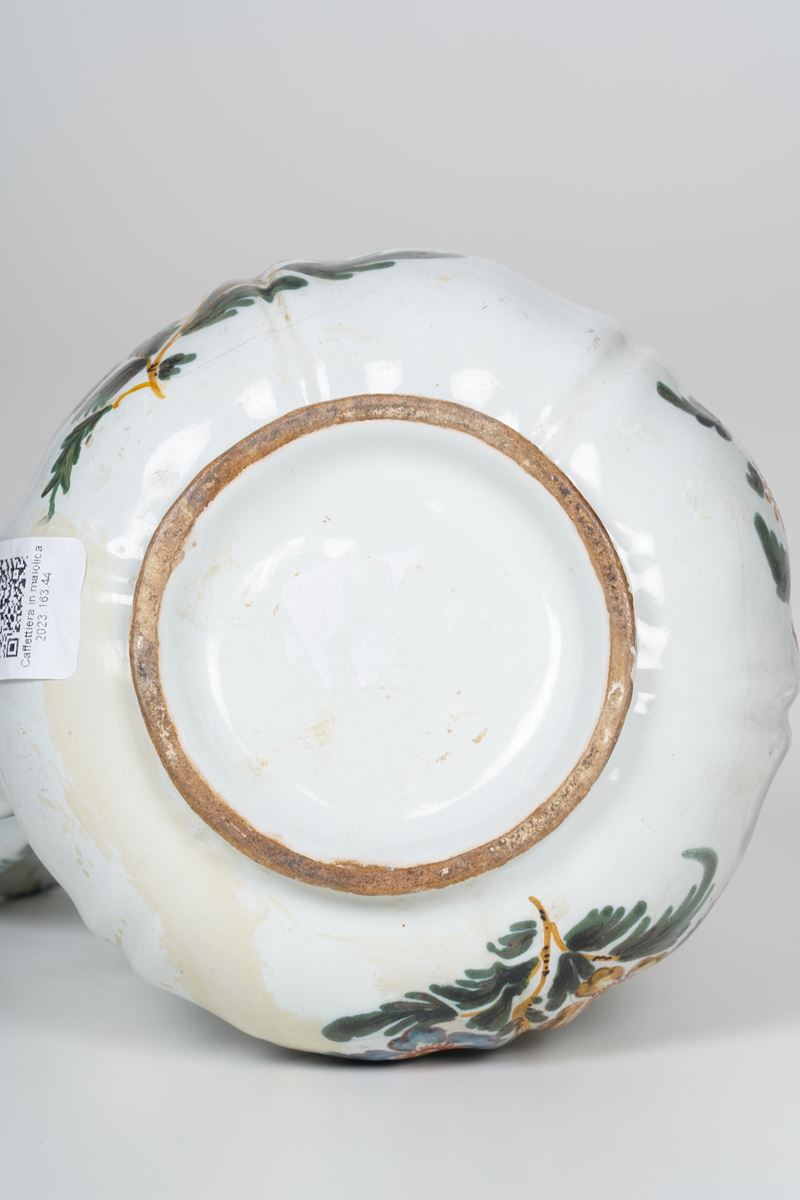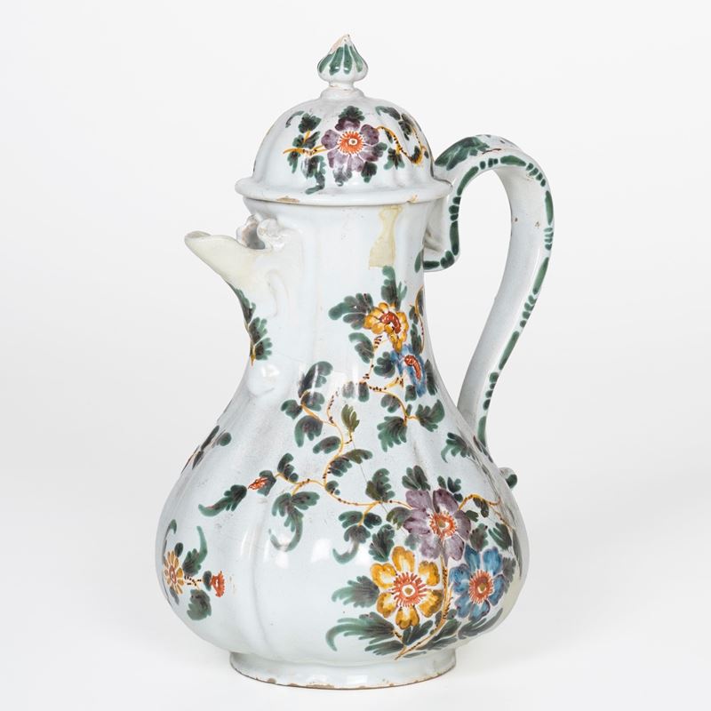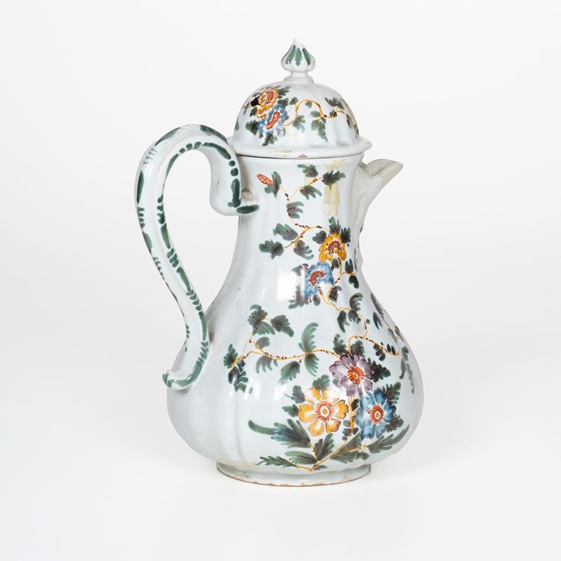 Maiolica. Marca: assente. Altezza cm 24,5. Conservazione: parte terminale del beccuccio integrata; felatura alla base del corpo con vecchio restauro; coperchio rotto in 2 frammenti e incollato.