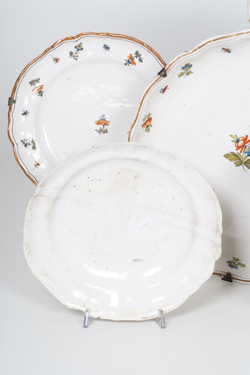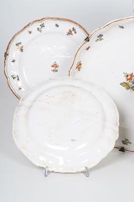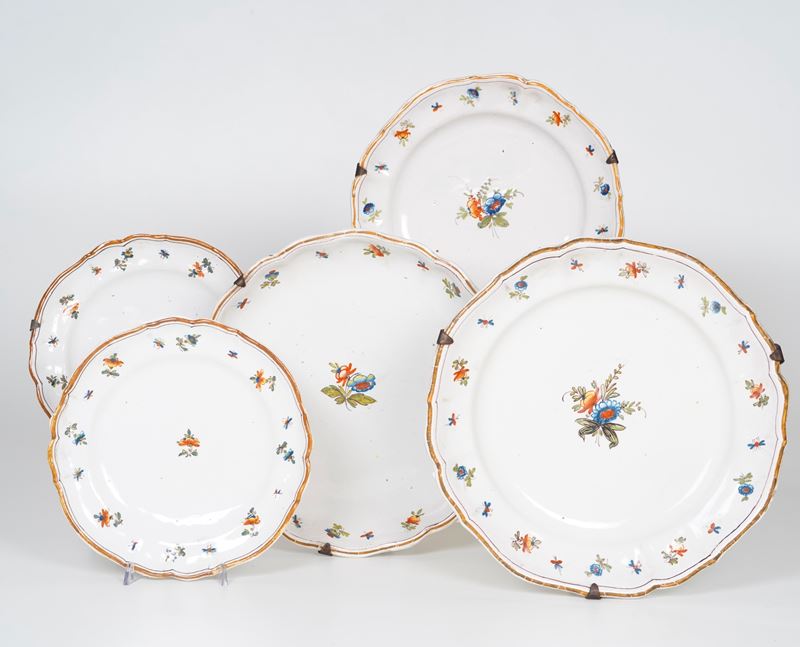 Maiolica. Marca: assente. Diametro: cm 32; cm 30,5; cm 27,6; cm cm 23,5. Conservazione: ottima; due piatti con felatura.