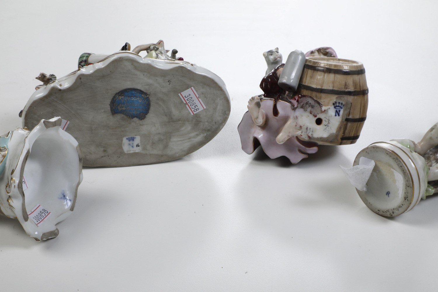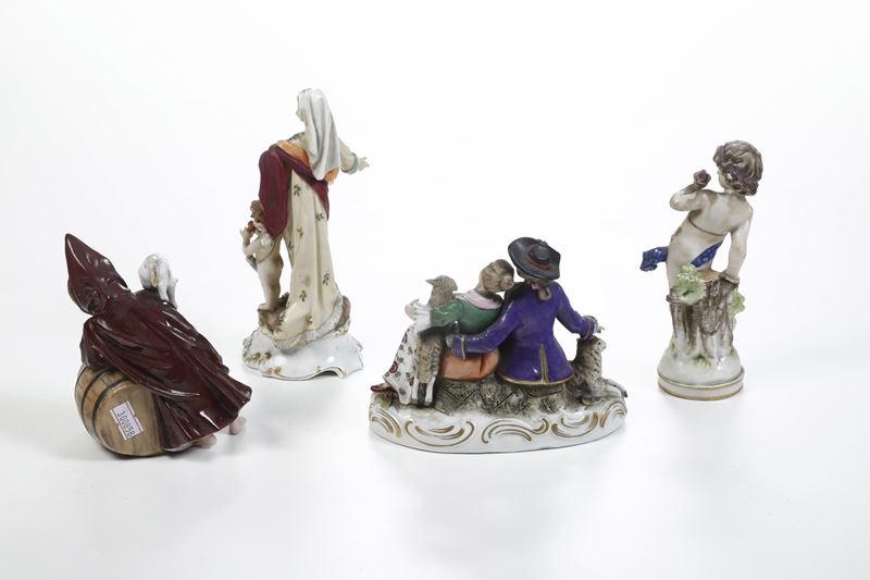 Porcellana policroma. Marca: "N" con corona; "R" e spade incrociare in blu. Altezza massima cm 18. Conservazione: due teste e un braccio incollate; restauri e mancanze minori.