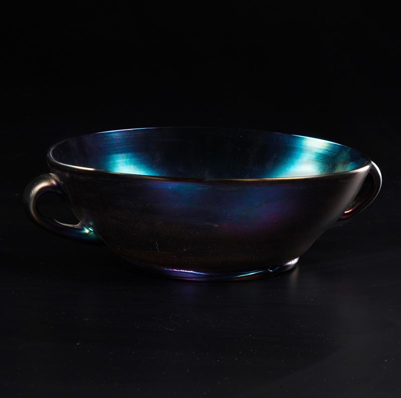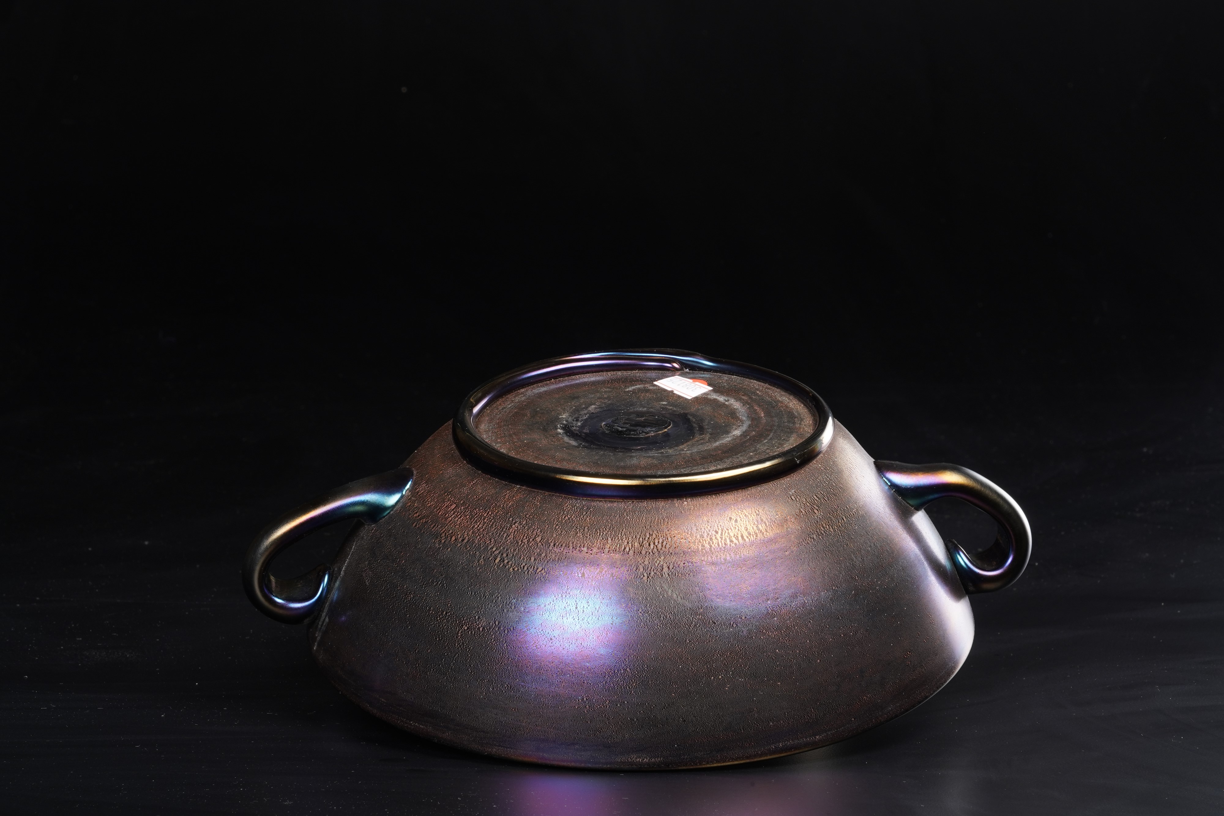 Vetro iridescente. Dimensioni: altezza cm 9; diametro cm 25. Conservazione: ottima.
