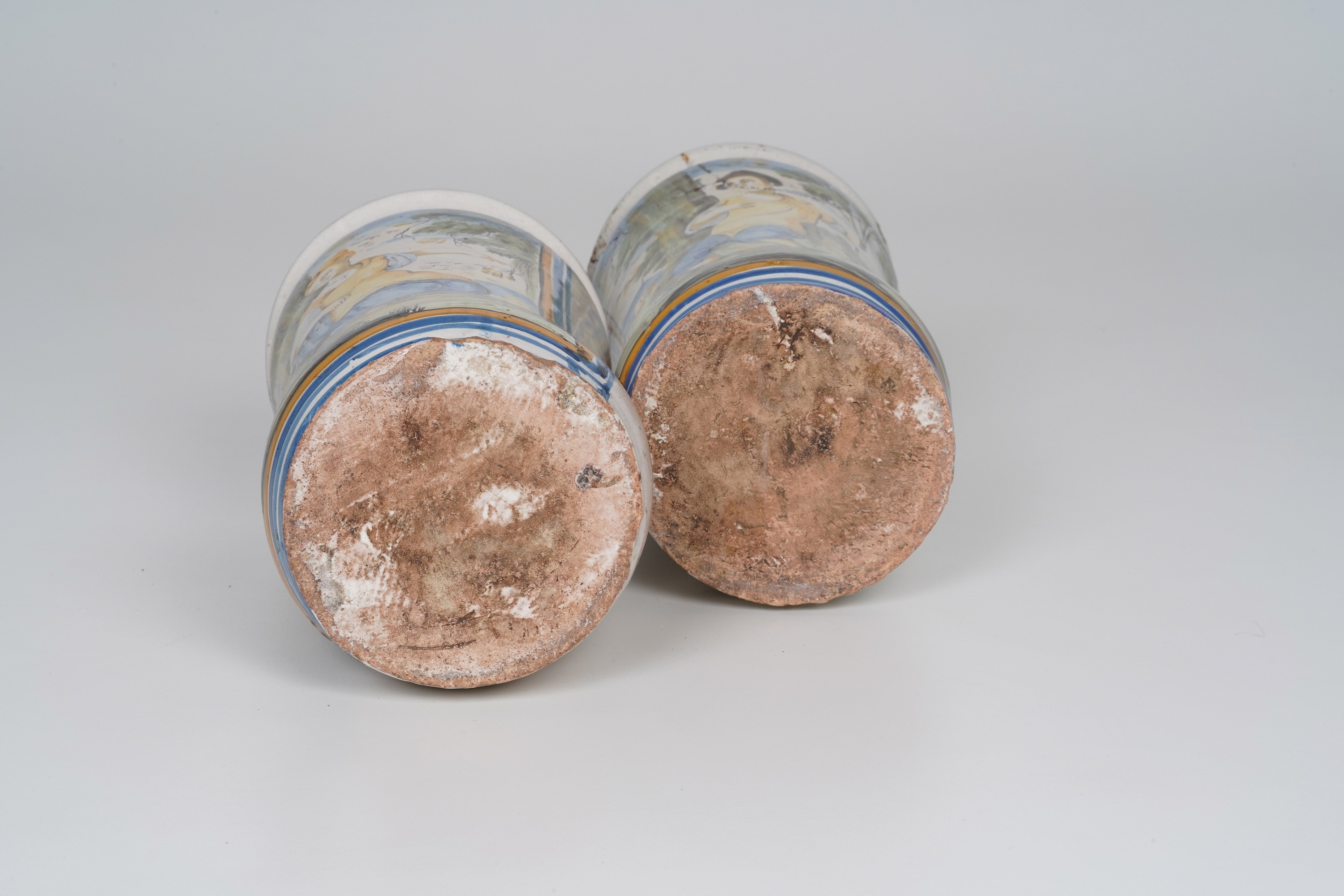 Maiolica. Marca: assente. Altezza cm 25. Conservazione: un albarello con piccole sbeccature ai bordi e insignificante felatura; l’altro con rotture nella parte superiore, incollate.