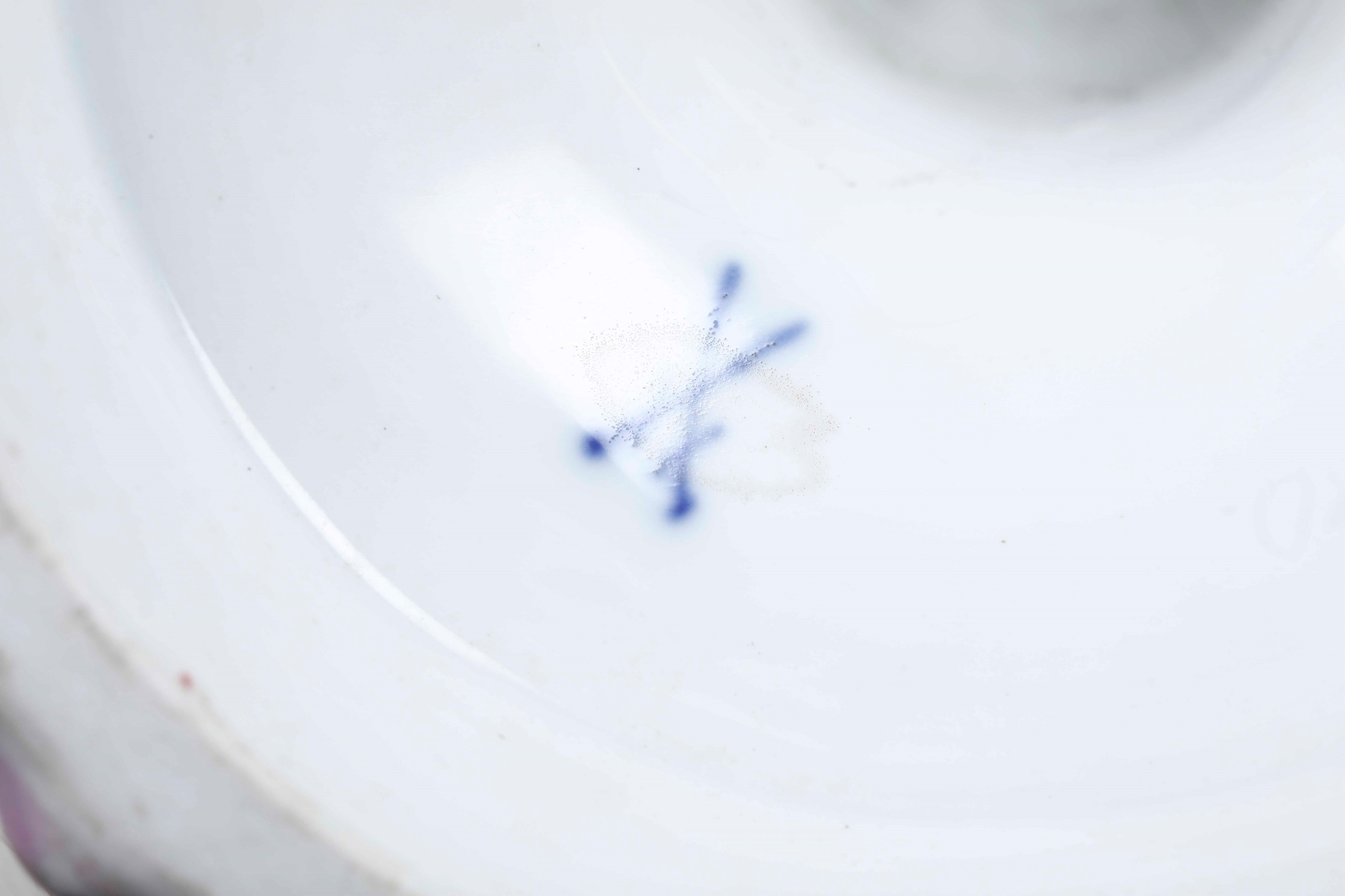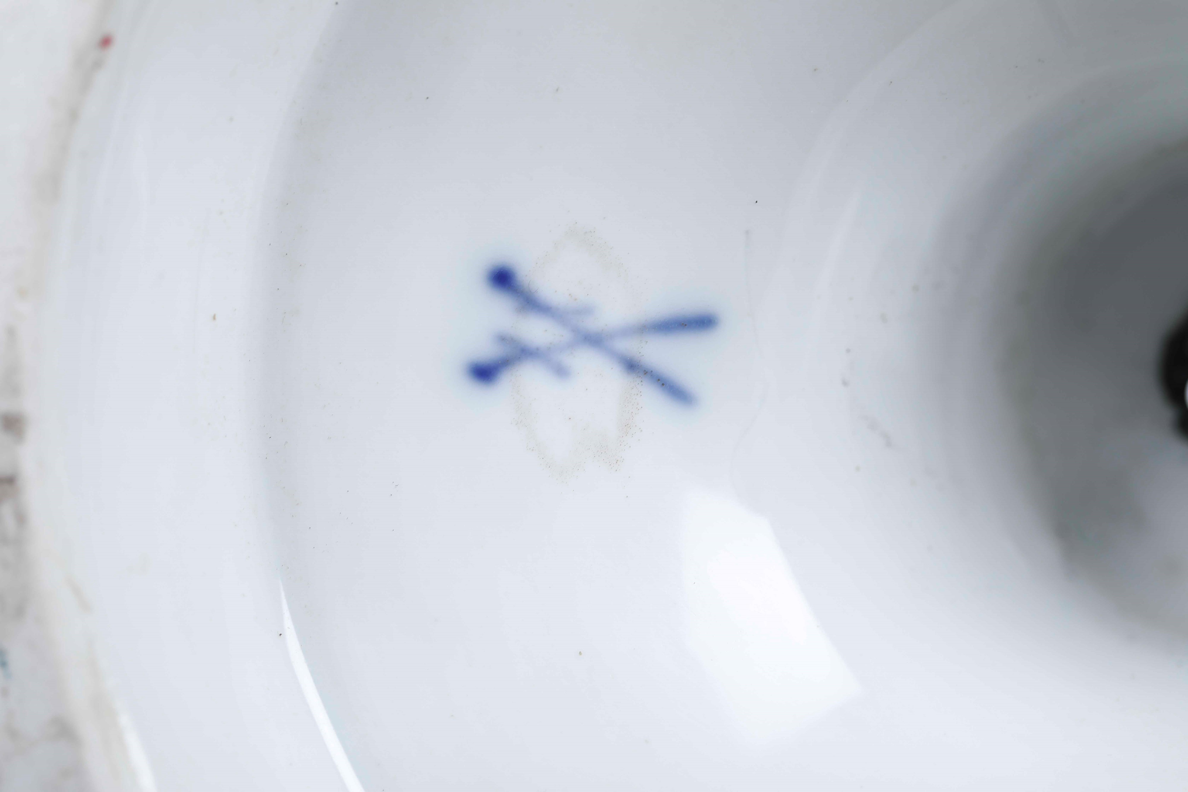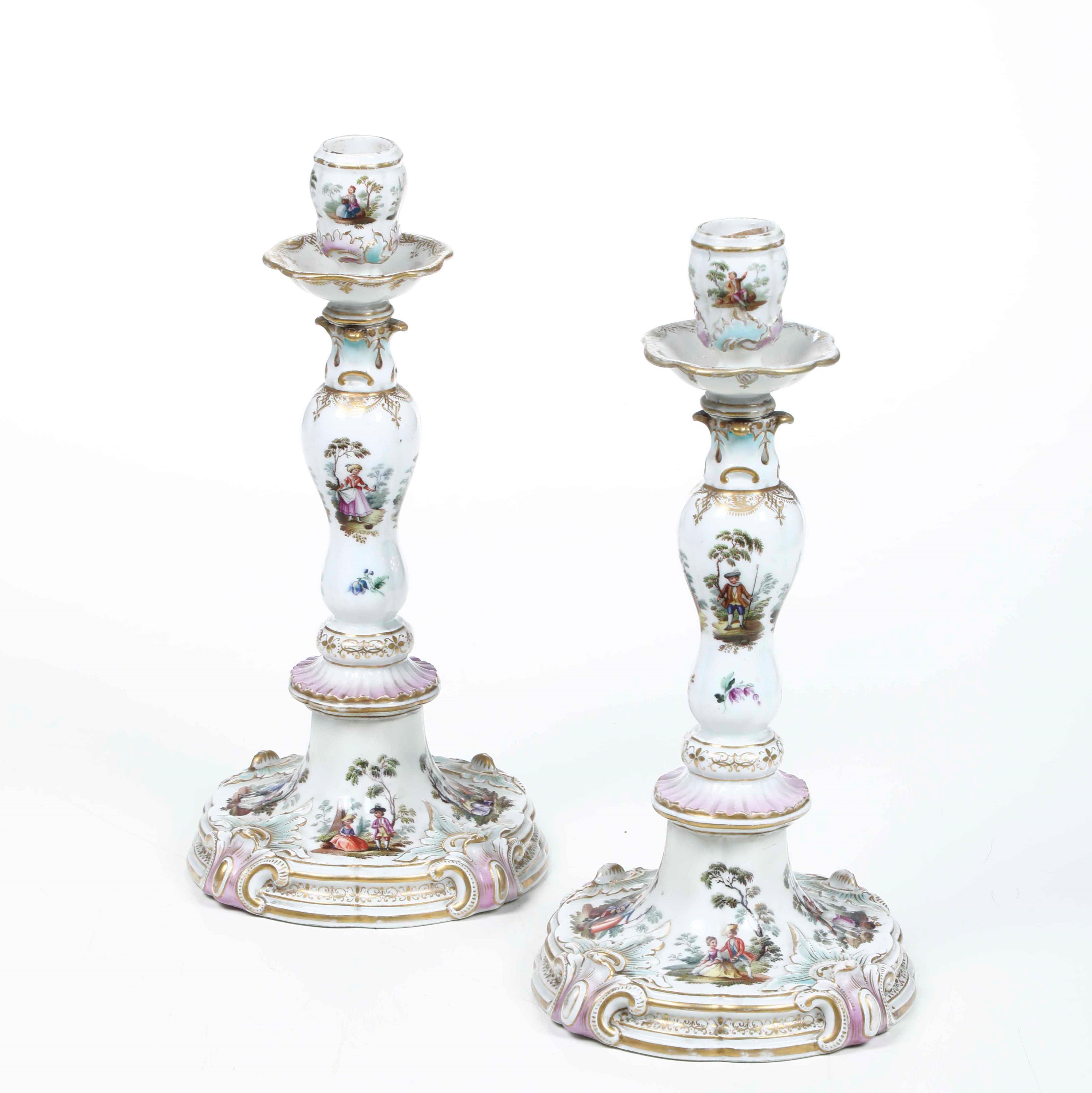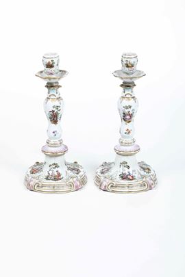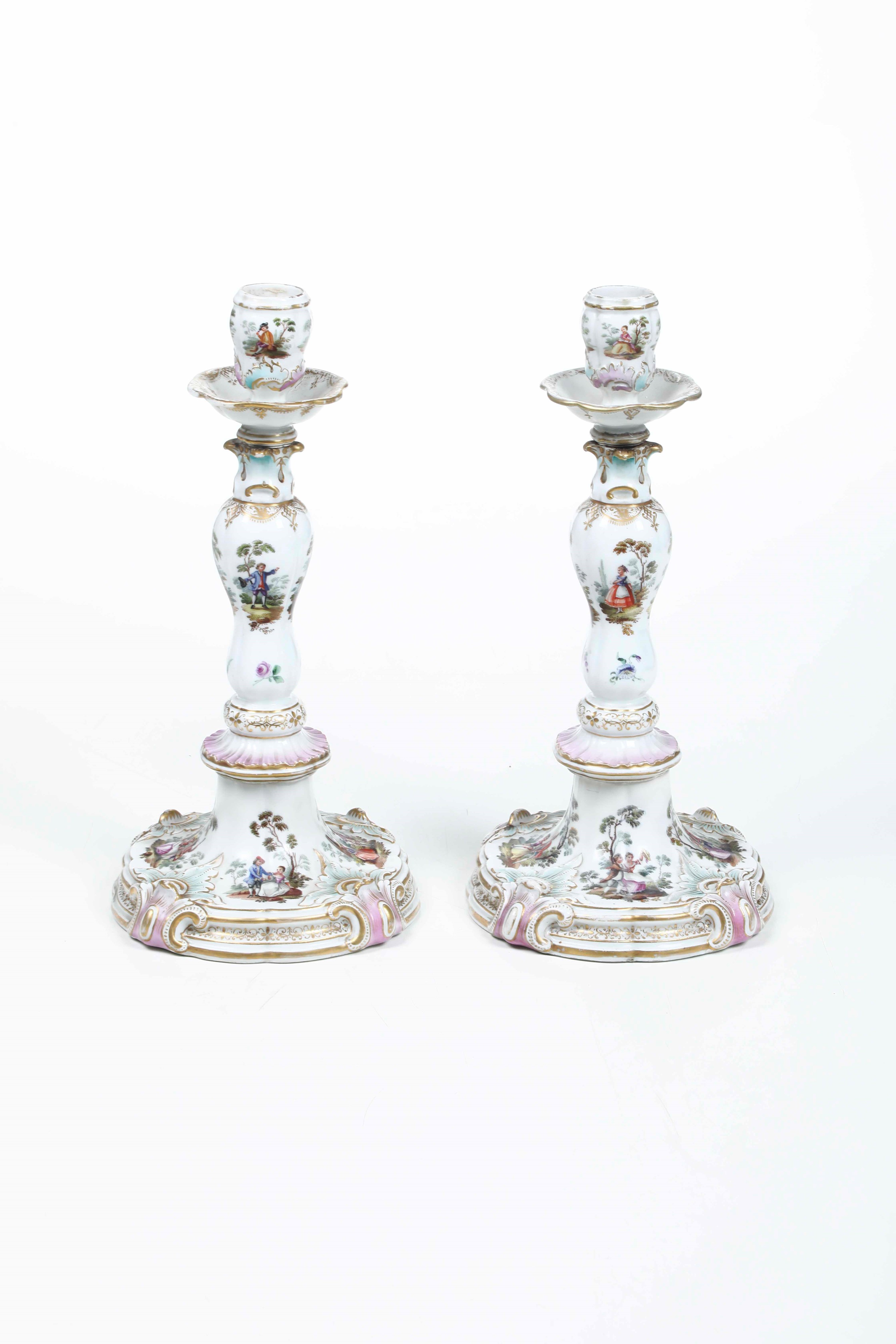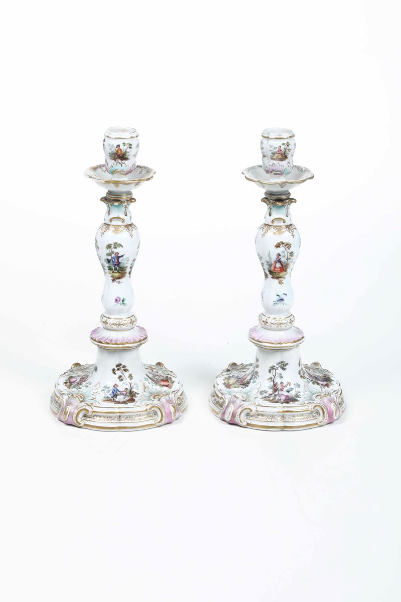 Porcellana policroma e dorata. Marca: spade incrociate in blu. Atezza cm 28,3. Conservazione: una bobèche ricomposta in restauro; restauri alle parti superiori delle due basi.