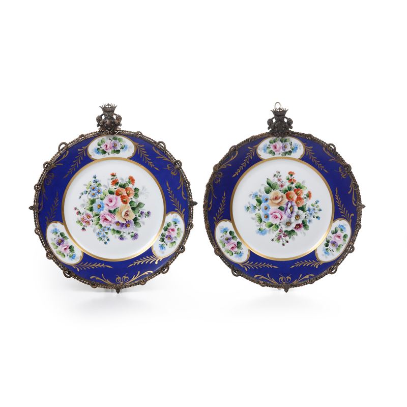 Porcellana policroma con montatura in bronzo dorato. Marca: pseudomarca di Meissen; e “Paint à la Main”. Diametro cm 29,5. Conservazione: ottima.