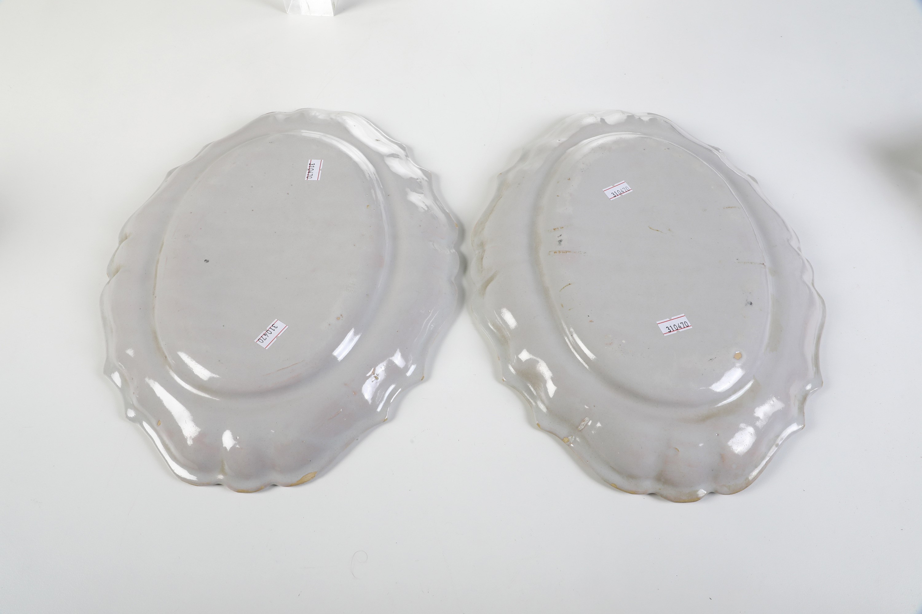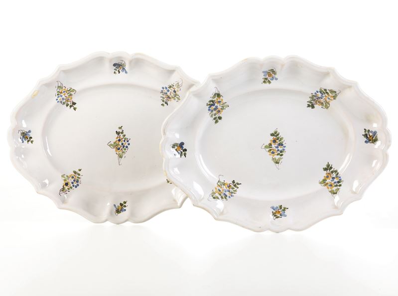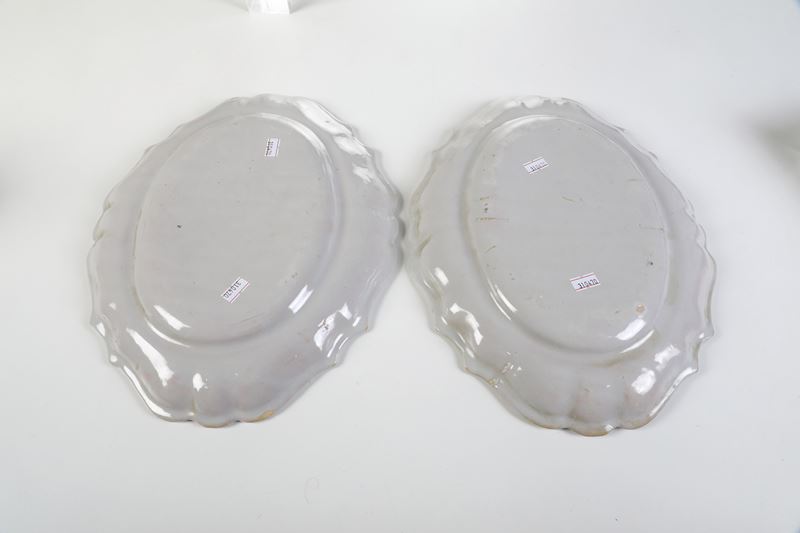 Maiolica a gran fuoco. Marca: assente. Dimensioni: 35,5x27,5. Conservazione: ottima; un piatto con leggera felatura.
