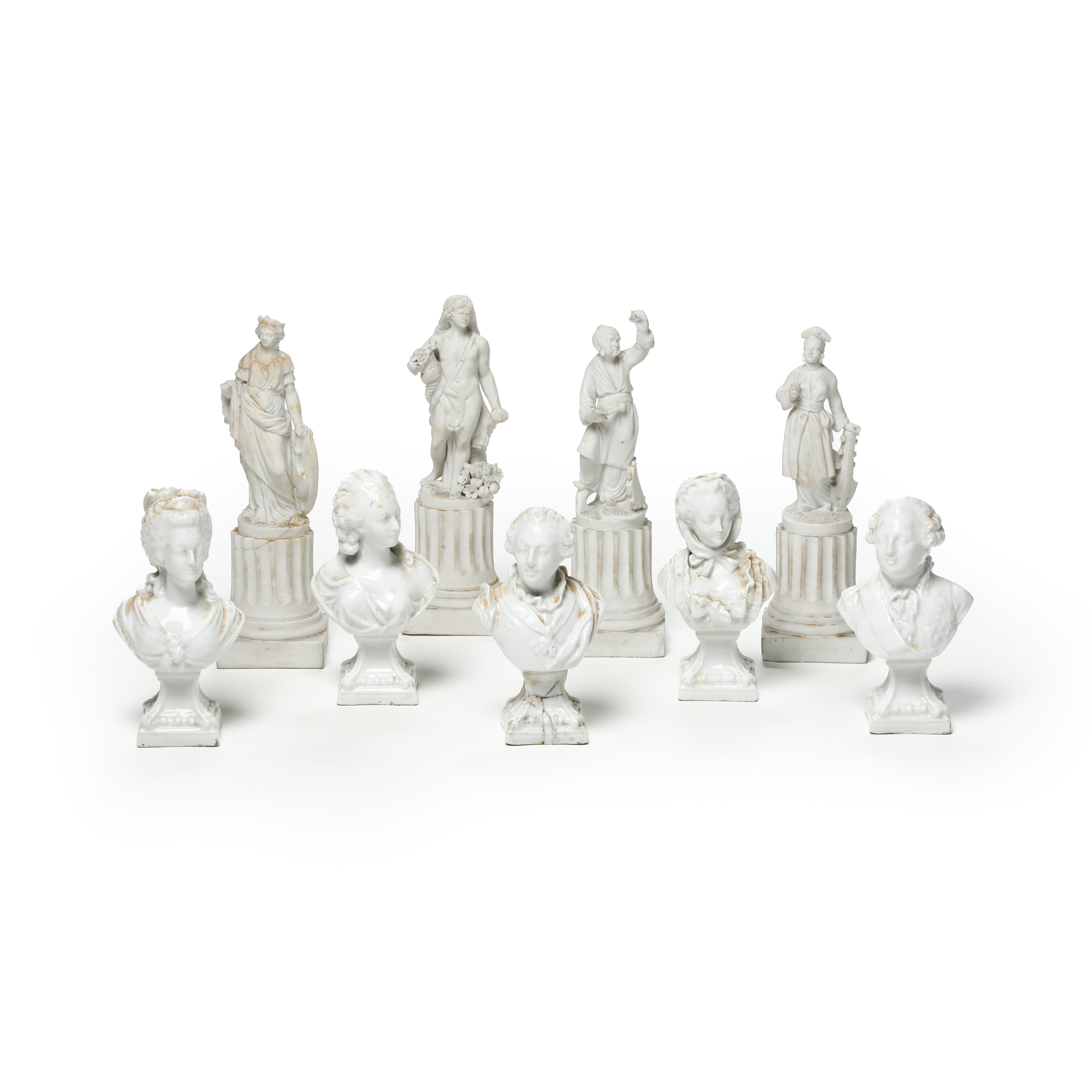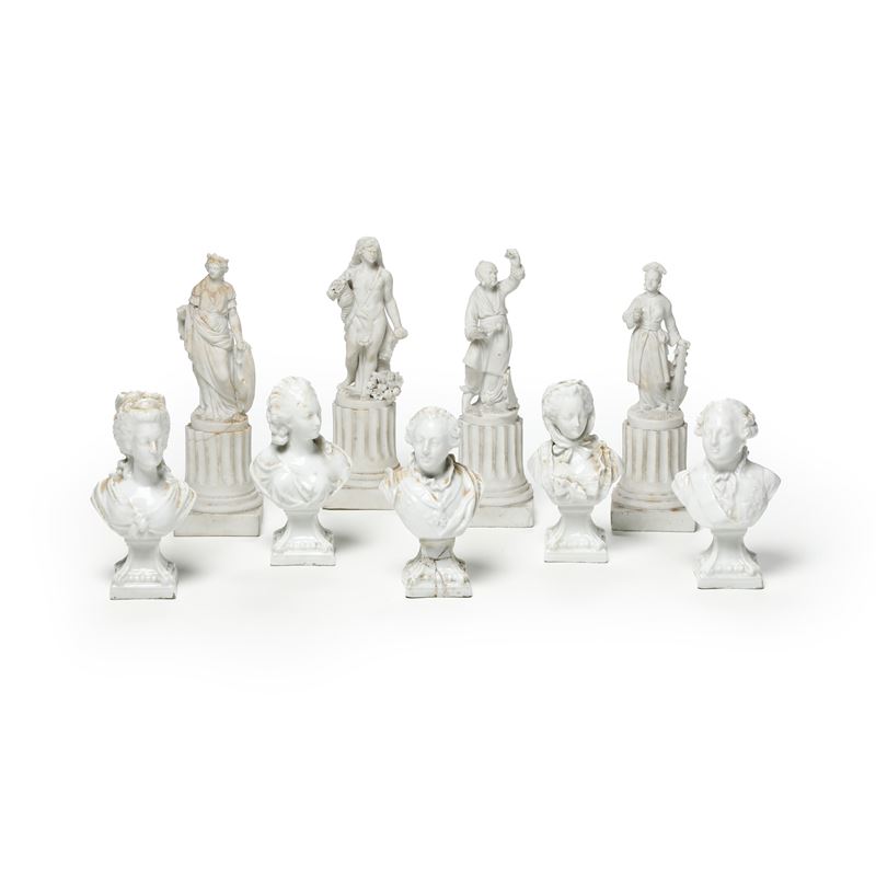 Porcellana e porcellana bisquit. Altezza massima cm 25 circa. Conservazione: base di un busto rotta in più frammenti e ricomposta in restauro; due figure con braccio destro mancante; mancanze minori