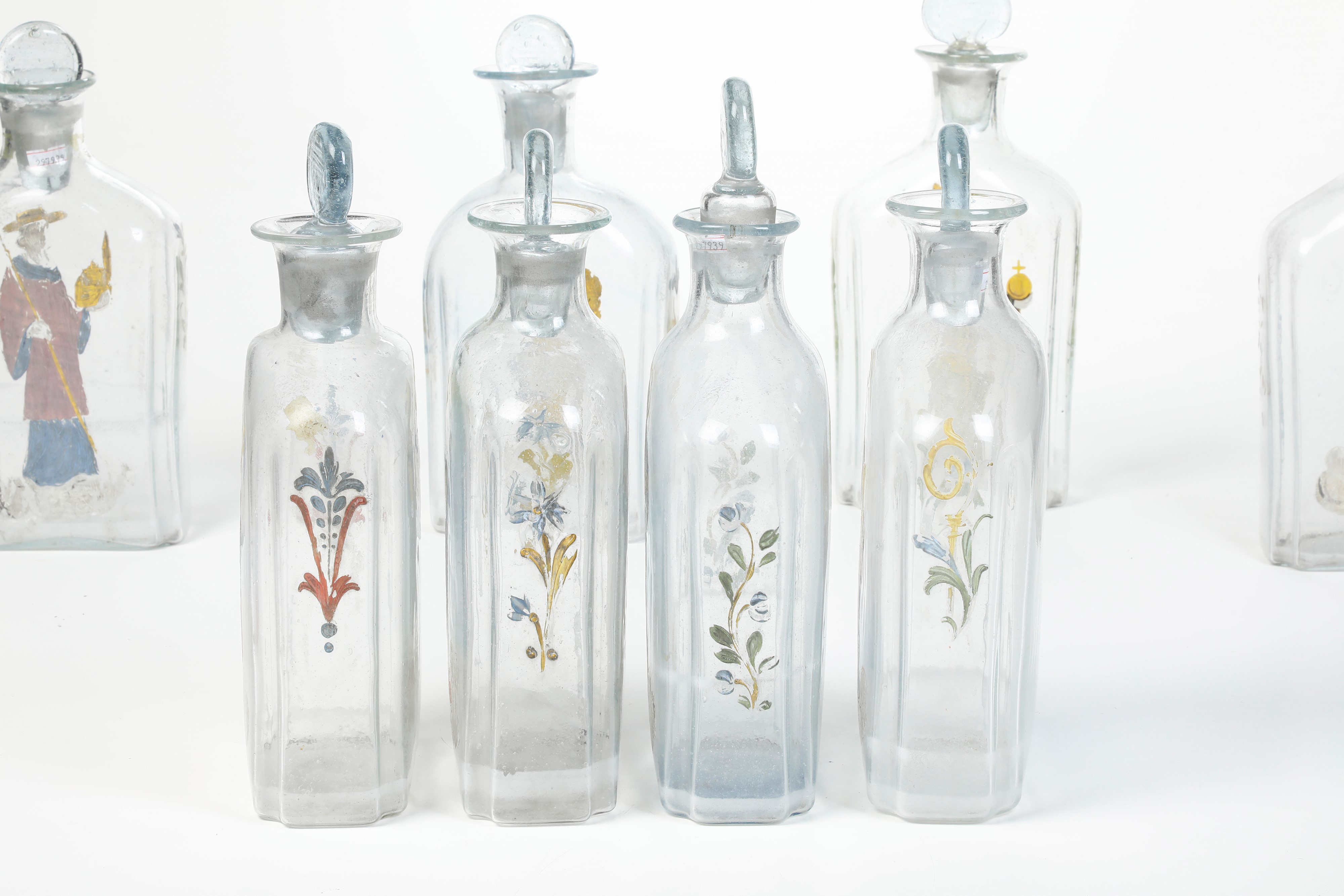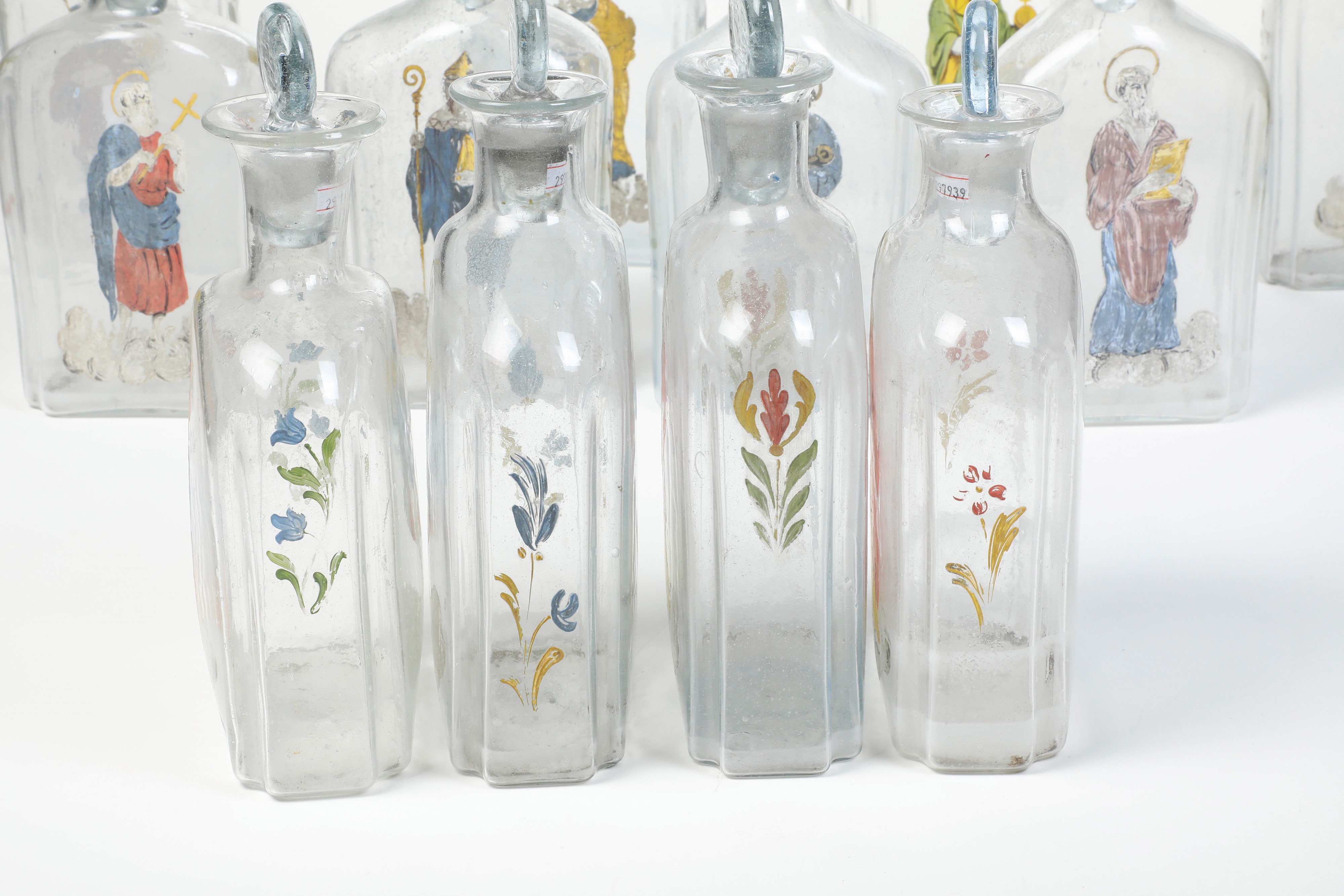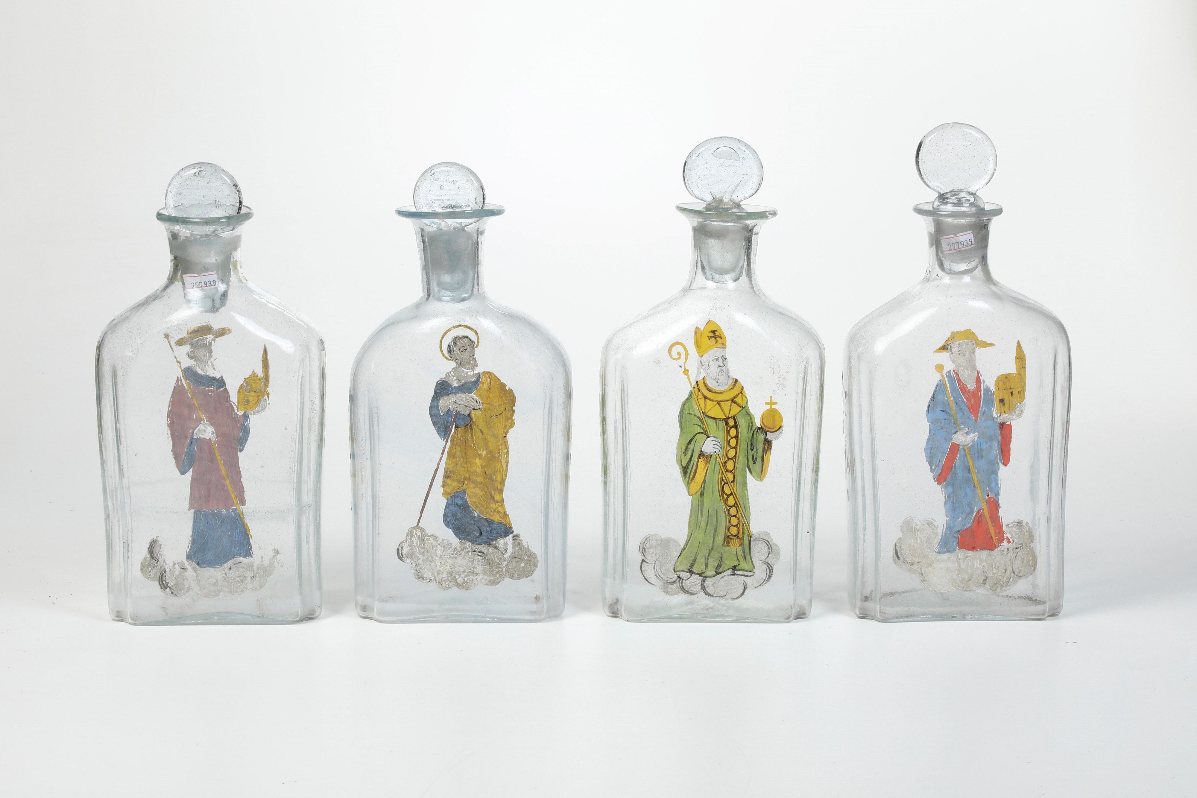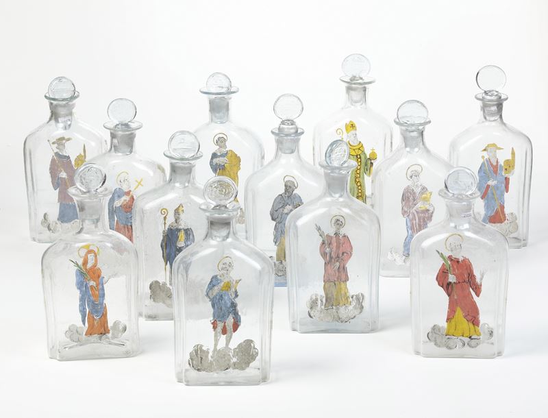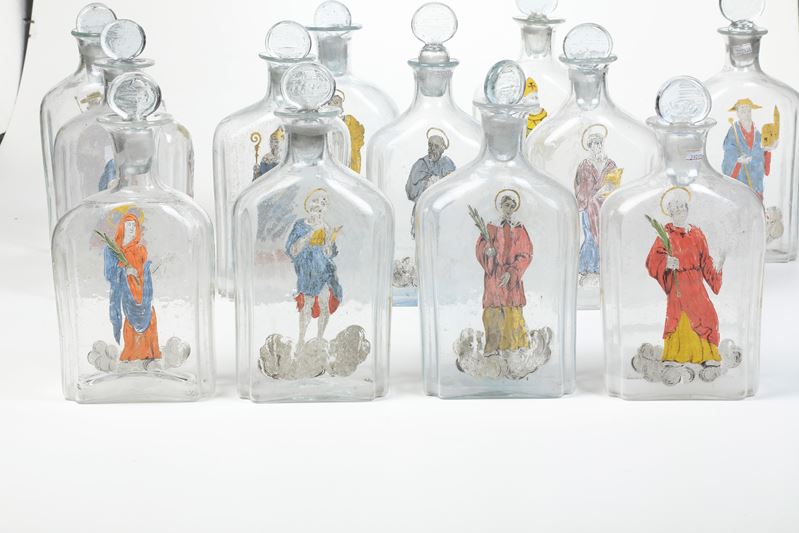 Vetro soffiato incolore decorato con figure di santi. Altezza cm 31,5 circa. Conservazione: buona; usure alla policromia.