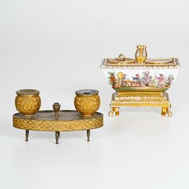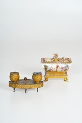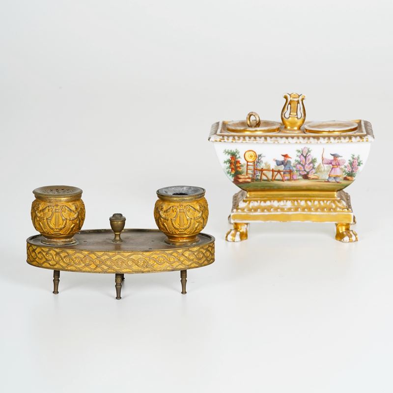 Porcellana e metallo dorato. Altezza massima cm 13; 15x9 circa. Conservazione: servizio a figure cinesi con presa dello spargi polverino rotta e incollata, estese usure all'oro.