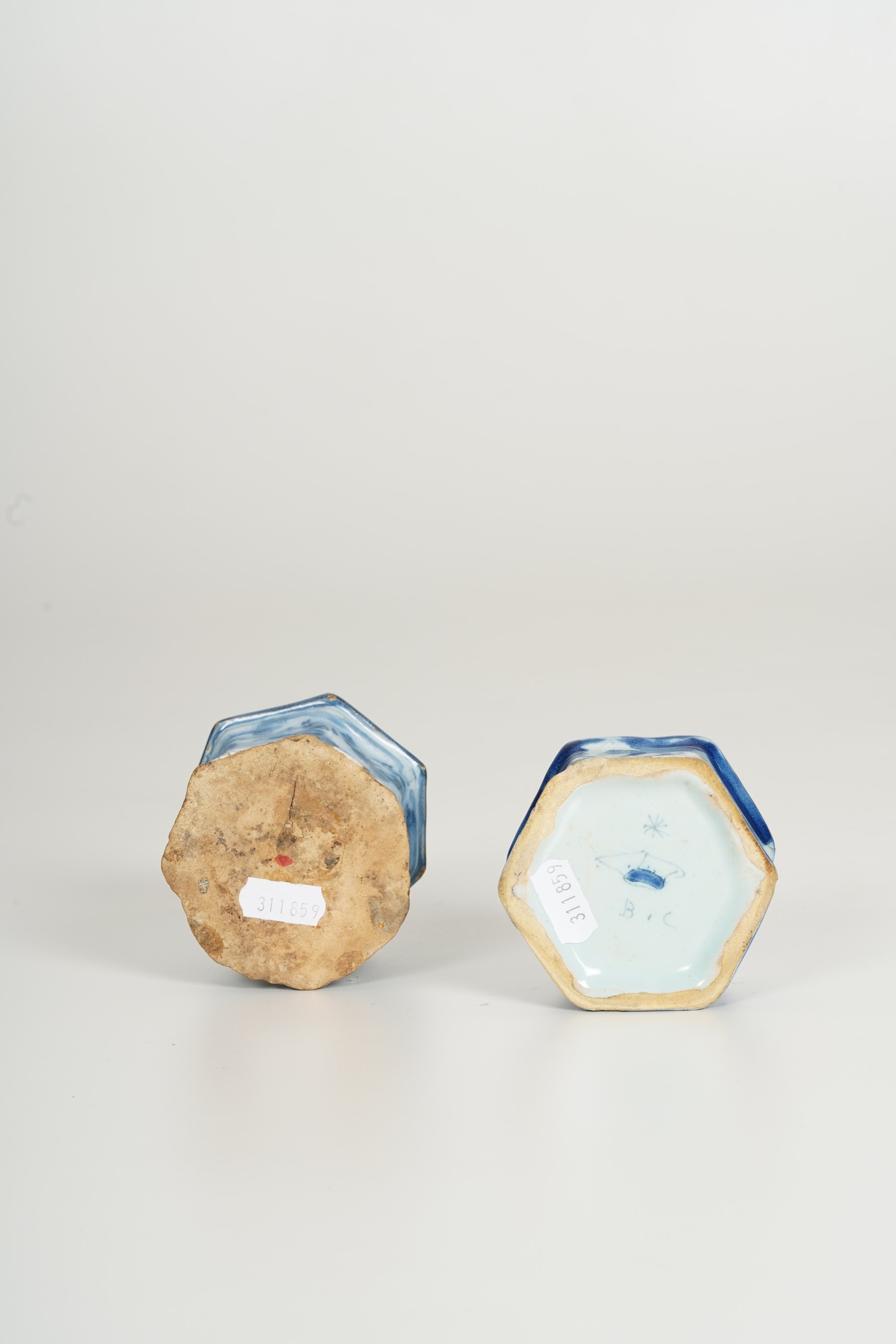Maiolica. Marca: per il pezzo ligure, corona con asterisco e "BC" per Bernardo Conrado. Altezza massima cm 7,2. Conservazione: sbeccature e qualche salto di smalto.