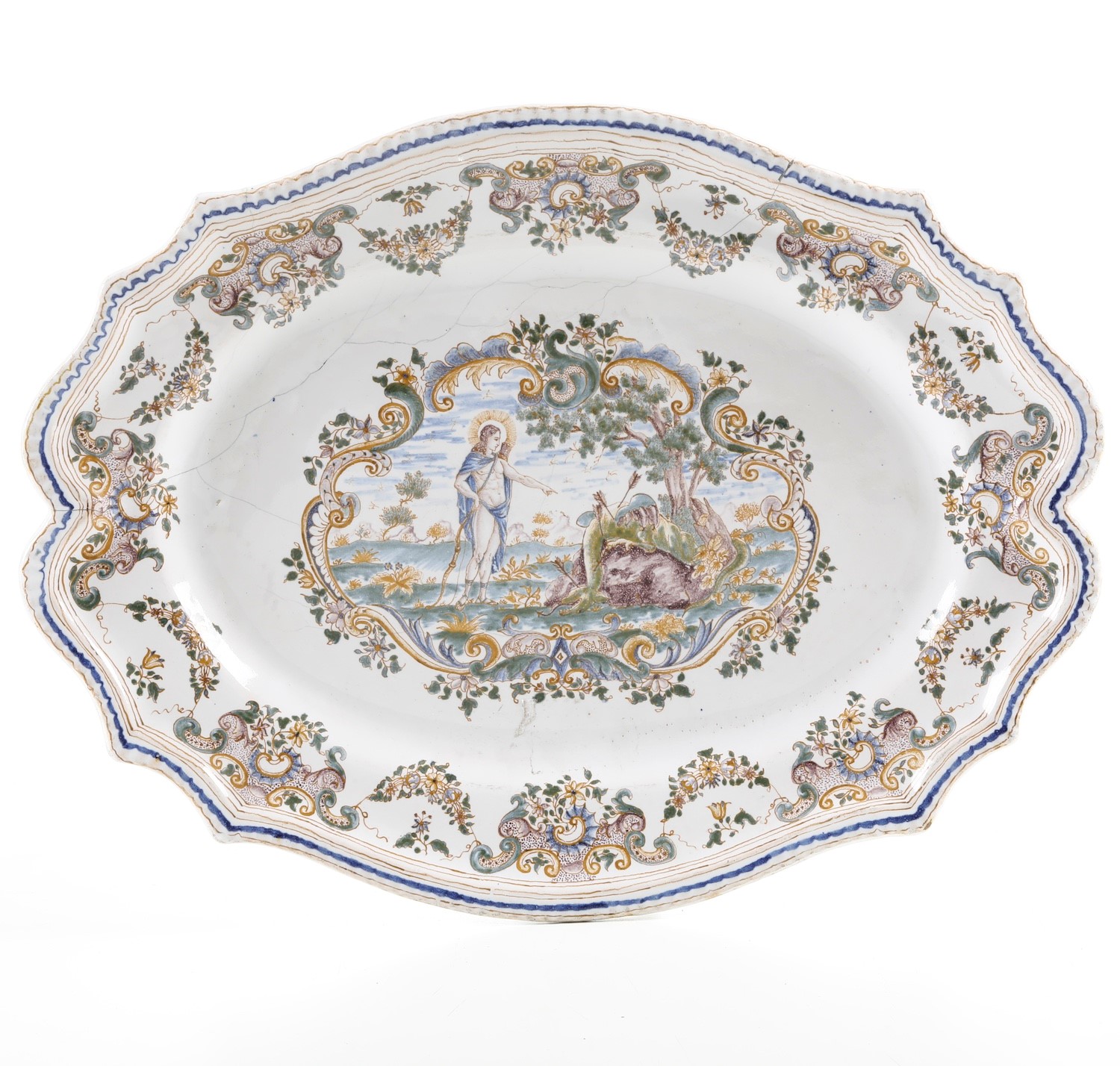 Grande piatto ovale dal bordo mistilineo decorato in policromia a gran fuoco con al centro il dio della mitologia greca Apollo che ha appena ucciso il drago con le frecce, incorniciato da esuberanti rocailles. Sulla tesa ghirlande di fiori alternate ad elementi rocaille.