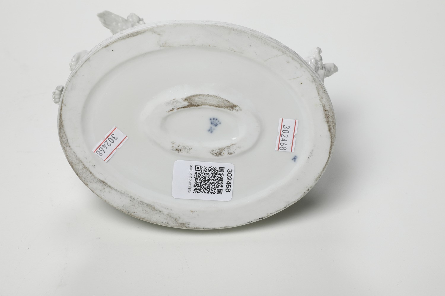 Porcellana bianca. Marca "N" con corona in blu. Altezza cm 20. Conservazione: buona; un'ala mancante.