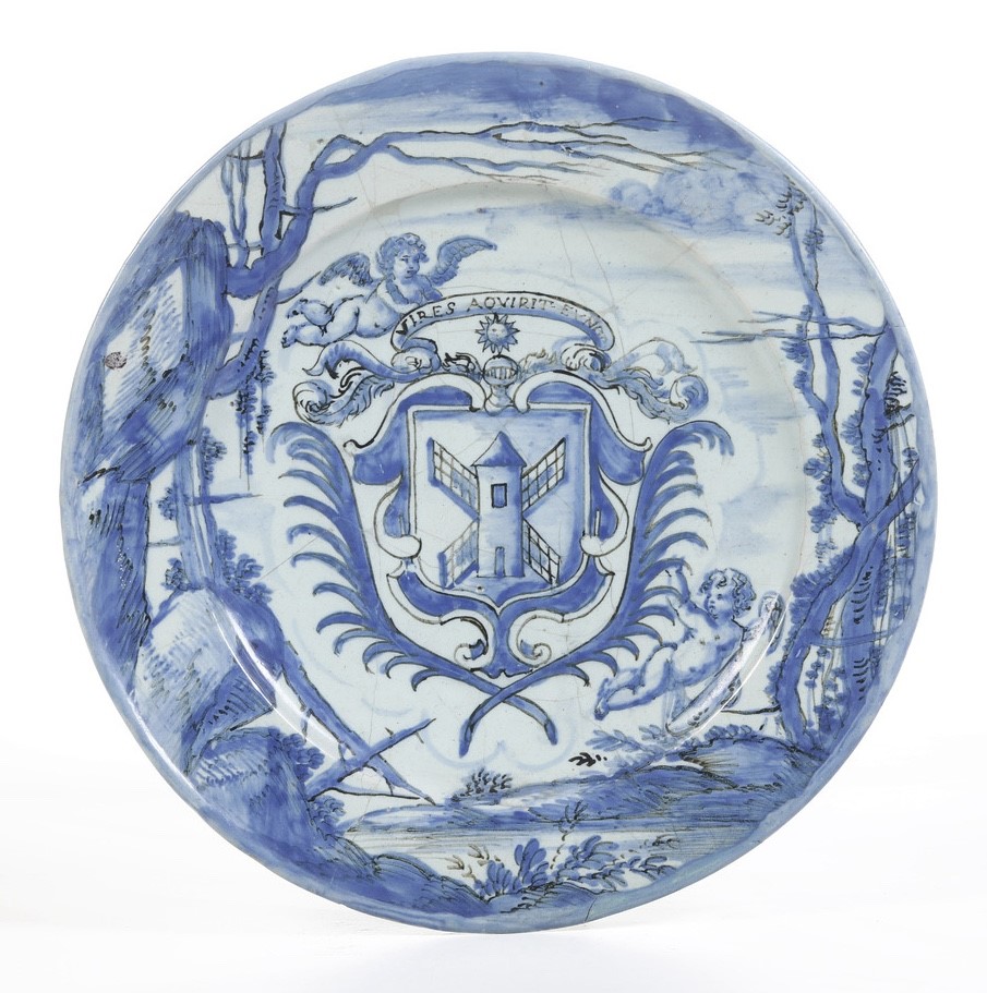 Maiolica. Marca: fortezza. Diametro cm 31,3. Conservazione: rotto in più frammenti e ricomposto; felature; sbeccature al bordo restaurate.