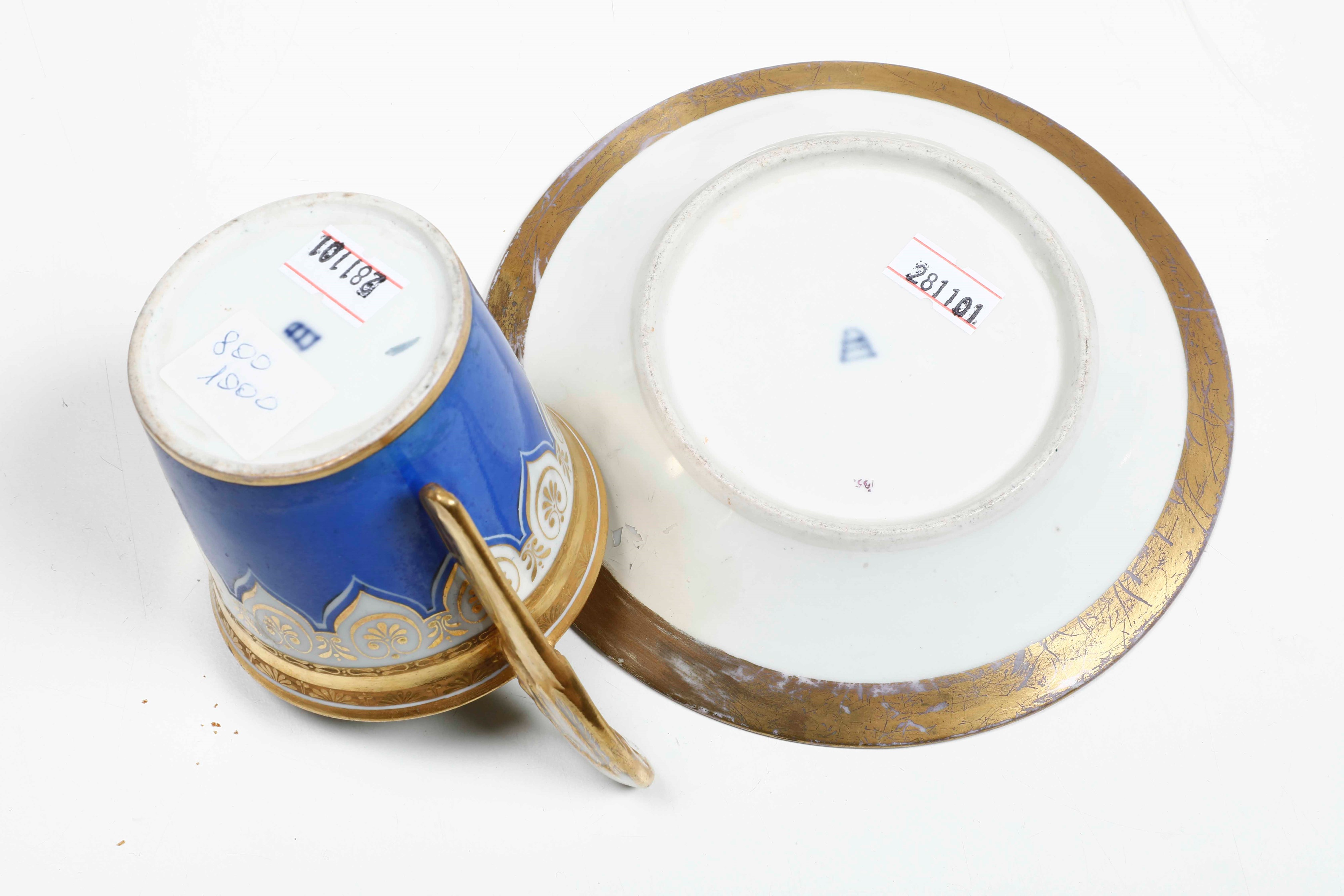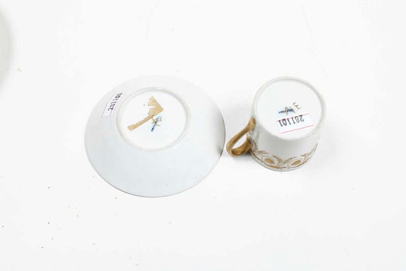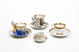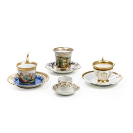Quattro tazze e piattini. Diverse manifatture, XIX secolo.