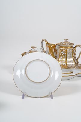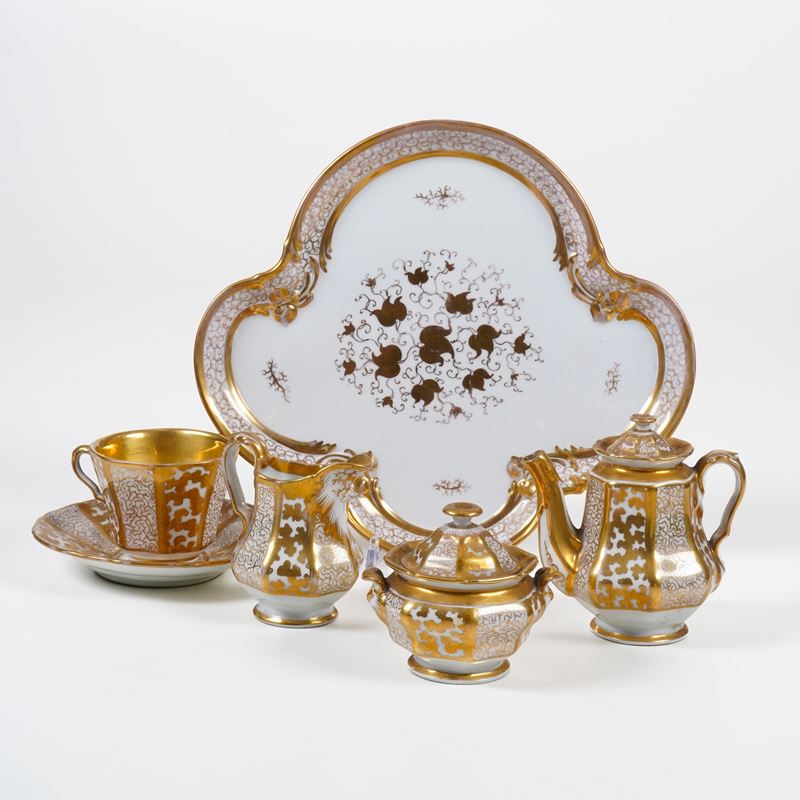 Porcellana. Marca: assente. Dimensioni: vassoio cm 30,5x27. Conservazione: ottima; insignificanti usure all’oro; manico della tazza incollato in restauro; piccola sbeccatura al bordo del coperchio della caffettiera; vassoio non pertinente.