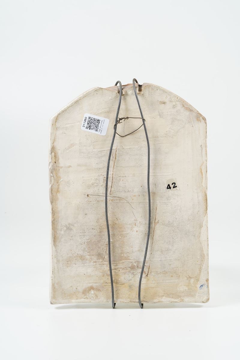 Maiolica. Altezza cm 33,5. Conservazione: buona. Mancanza alla sommità; piccoli salti di smalto.