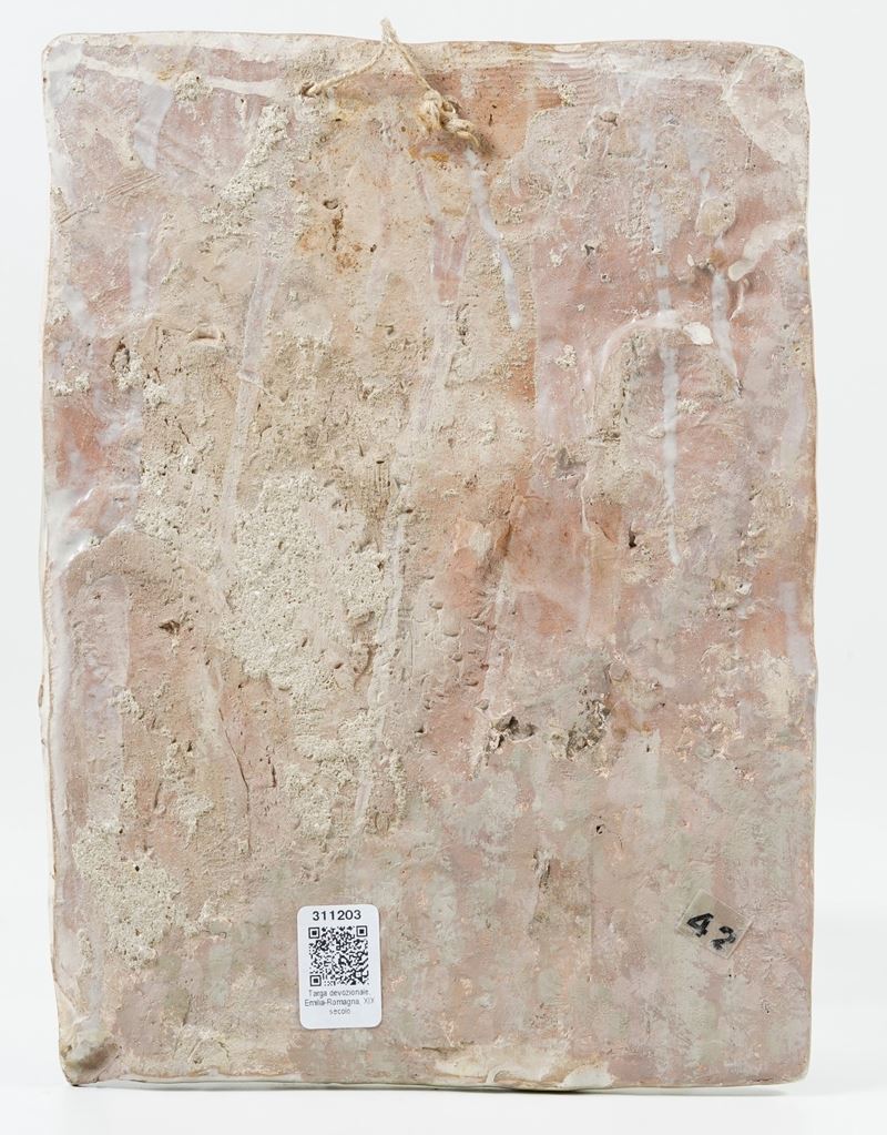 Maiolica. Altezza cm 33x24,5. Conservazione: restauri nella parte inferiore.