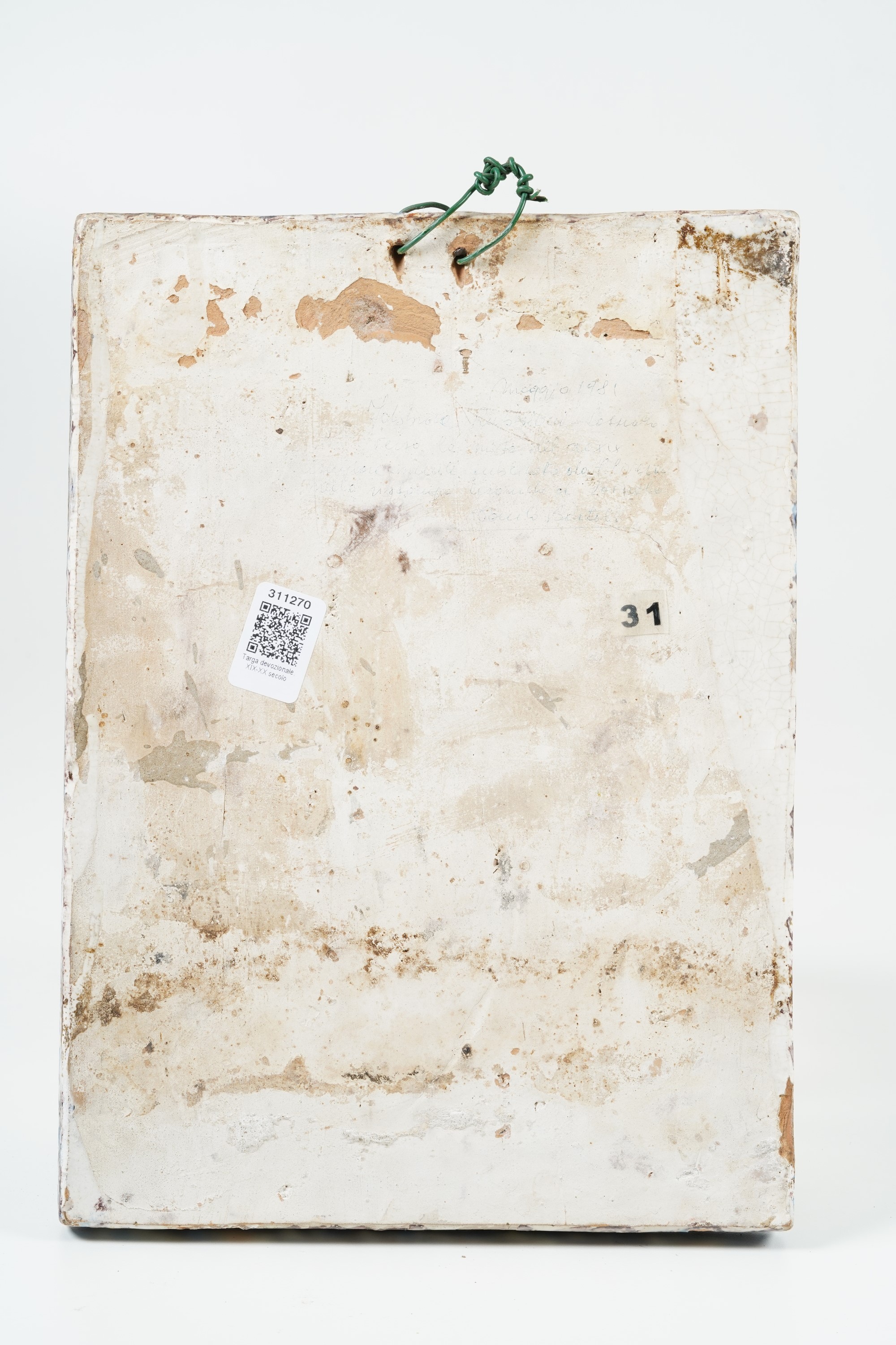 Maiolica. Altezza cm 36x26. Conservazione: buona; qualche salto di smalto.