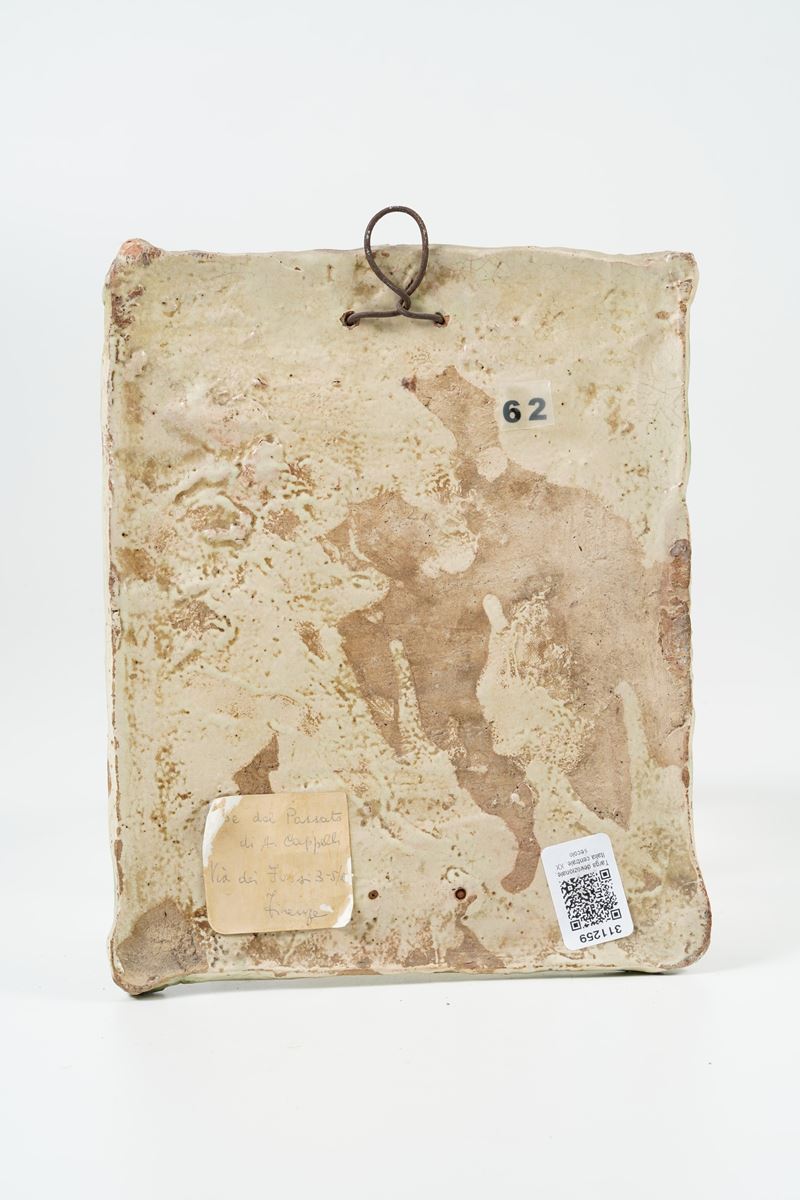 Maiolica. Altezza cm 26 x 22 circa. Conservazione: buona; qualche salto di smalto.