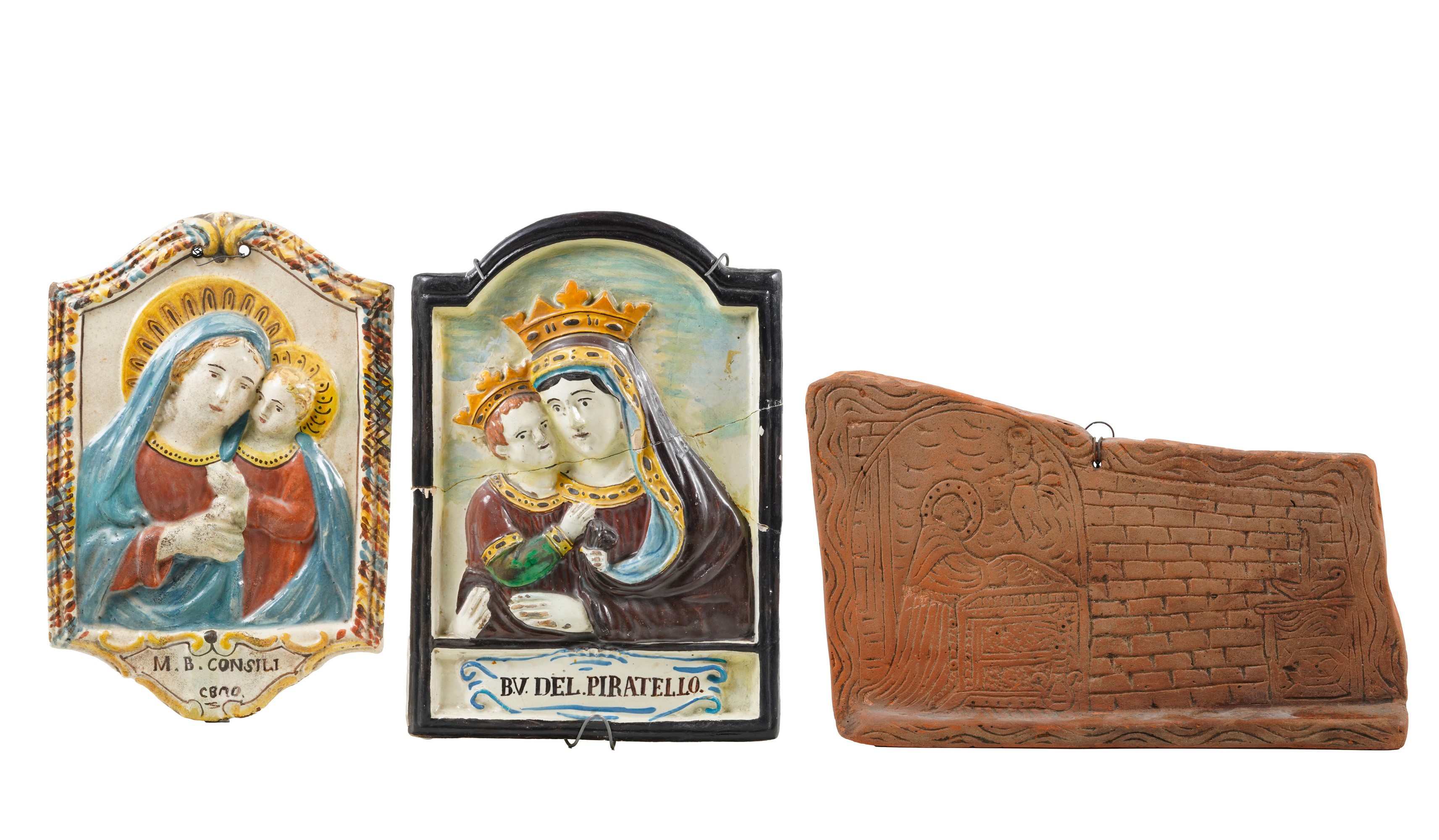 Maiolica e terracotta. Dimensione massima cm 26x40. Conservazione: targa con Beata Vergine del Piratello rotta in quattro frammenti e ricomposta; minime sbeccature in parte restaurate.
