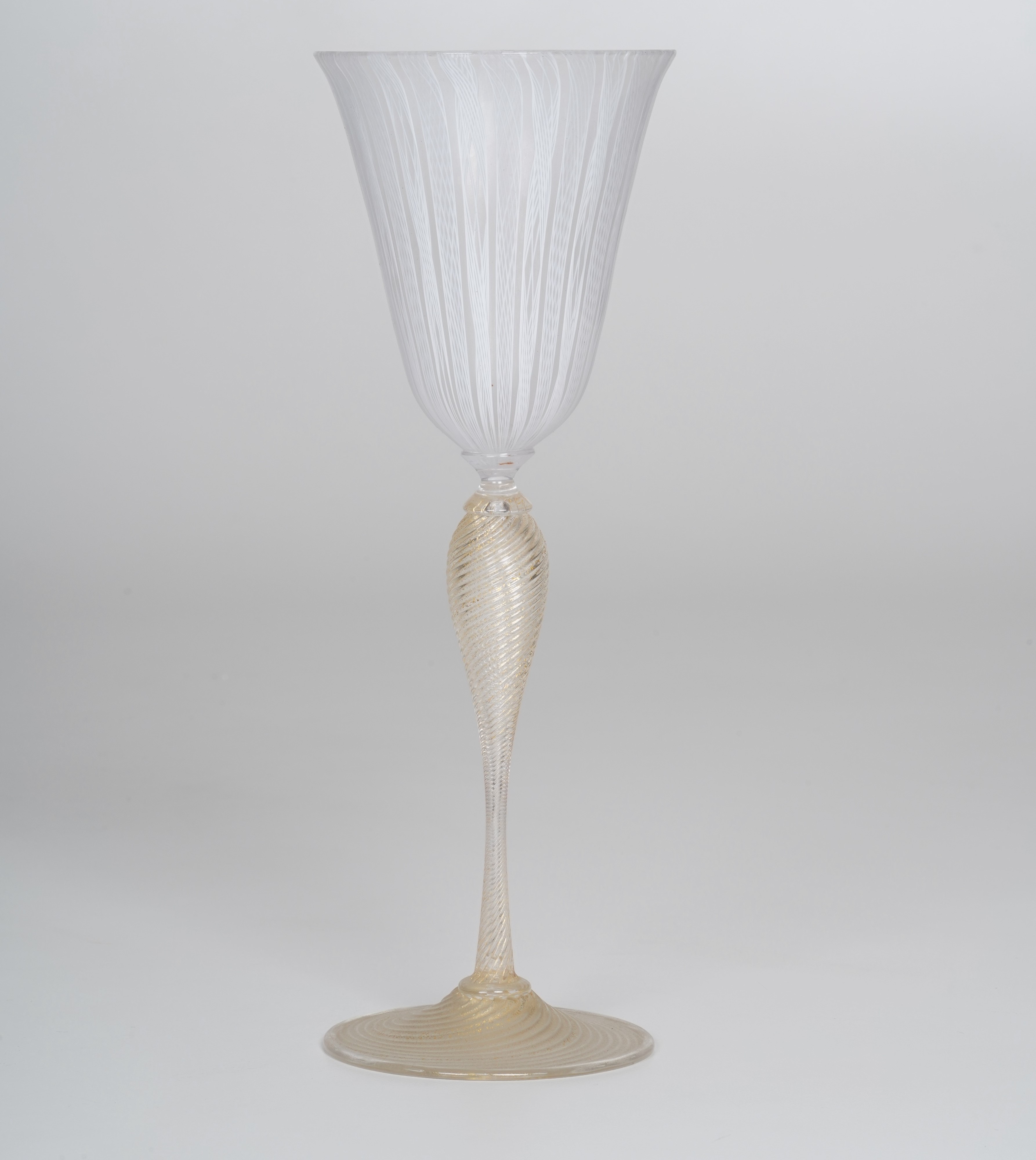 Cristallo e vetro. Altezza massima cm 27,7. Conservazione: bottiglia e calice in ottimo stato; bicchiere con sbeccature al bordo superiore.