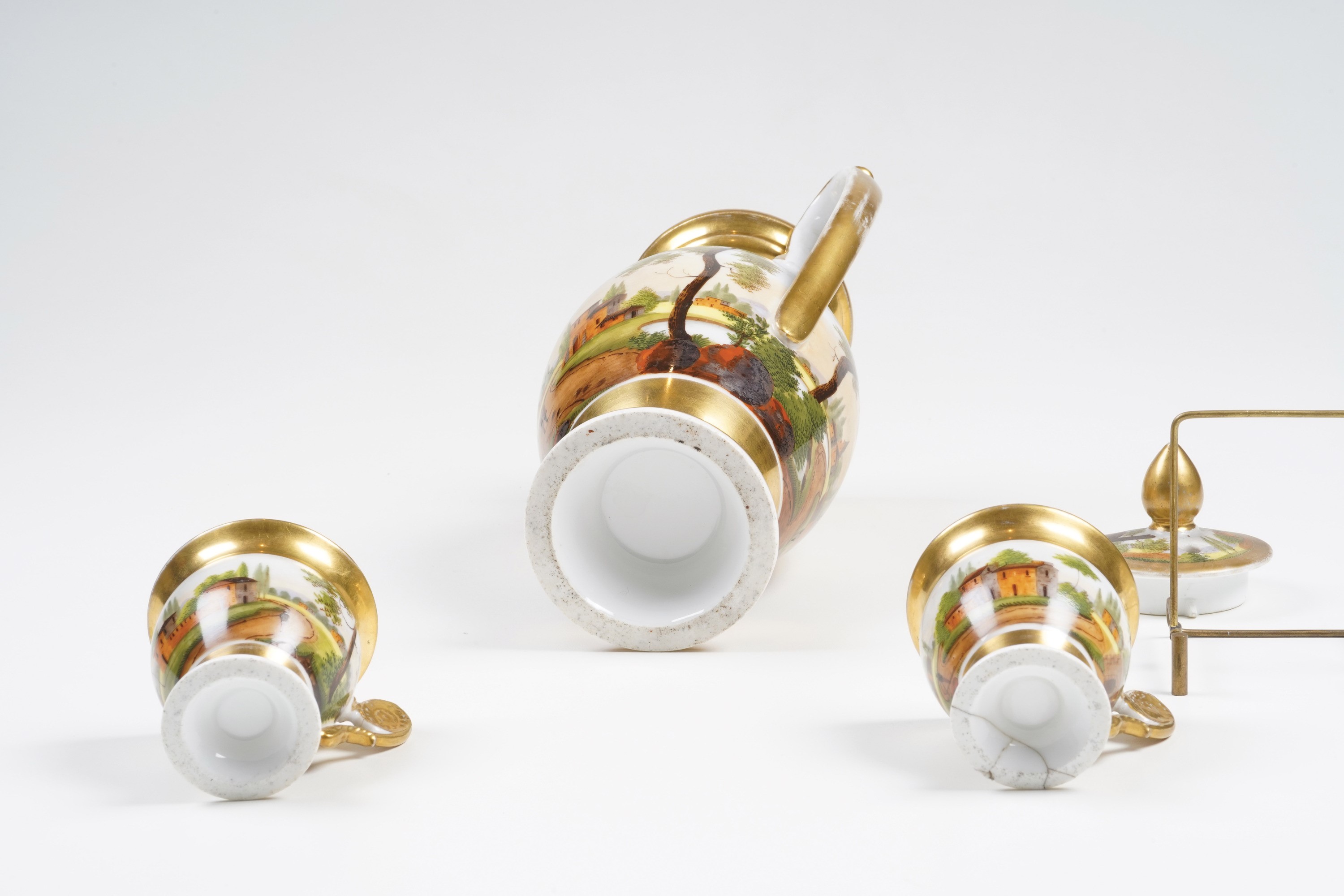 Porcellana decorata in policromia a paesaggi e dorata. Marca: assente. Dimensioni: altezza caffettiera cm 26,5; altezza tazza cm 7,8; diametro piattino cm 11,9. Conservazione: insignificante rottura al bordo interno del coperchio; una tazza con parte della base rotta in più frammenti e incollata; usure all'oro.