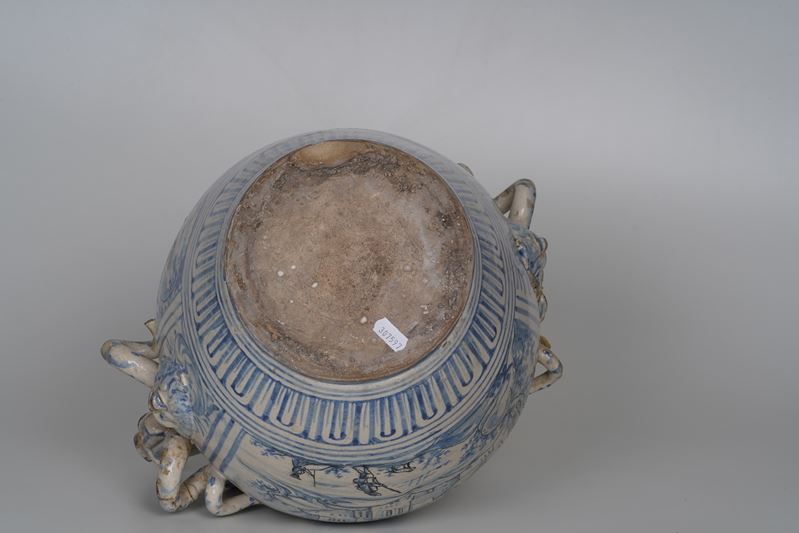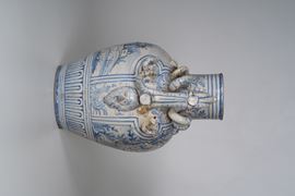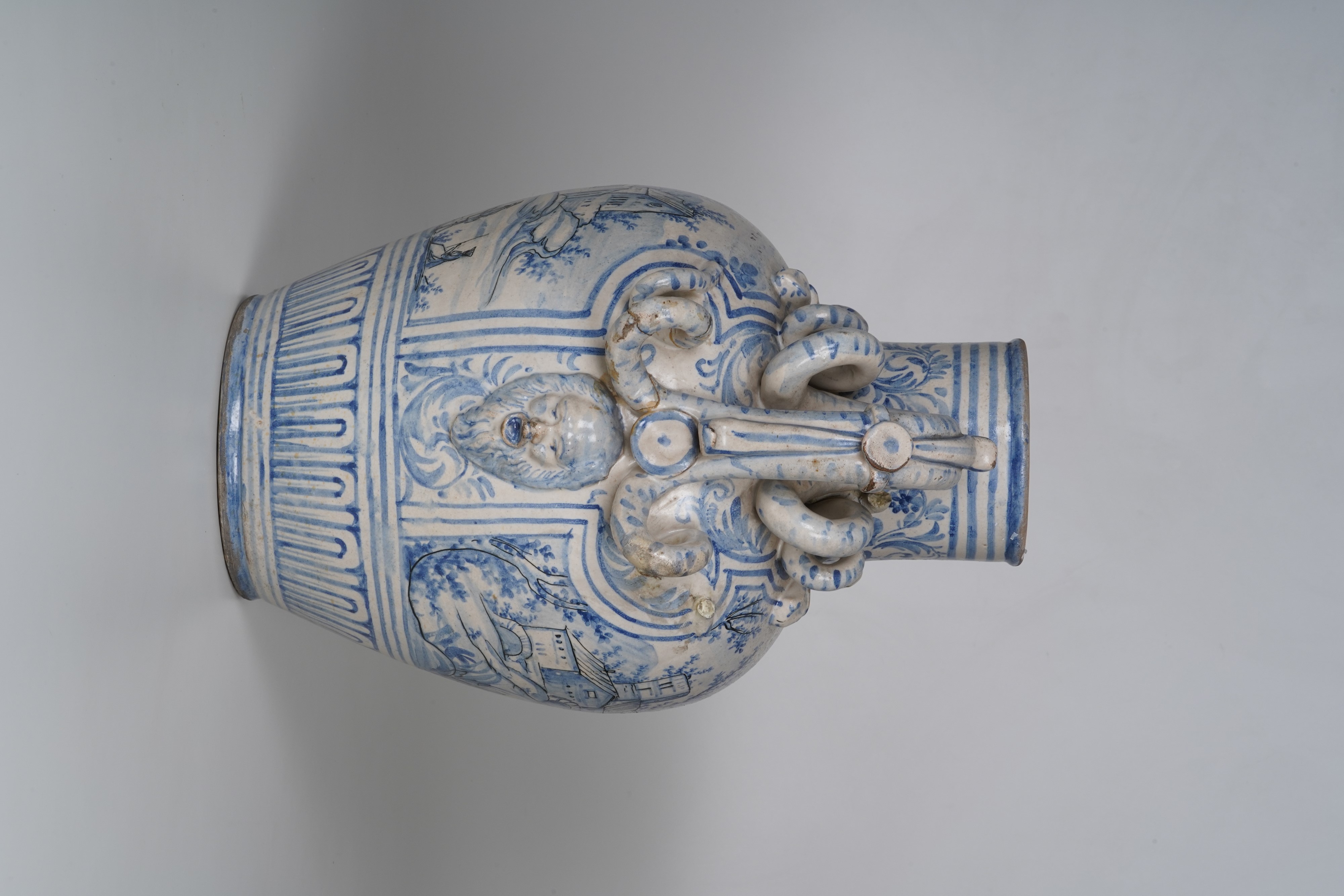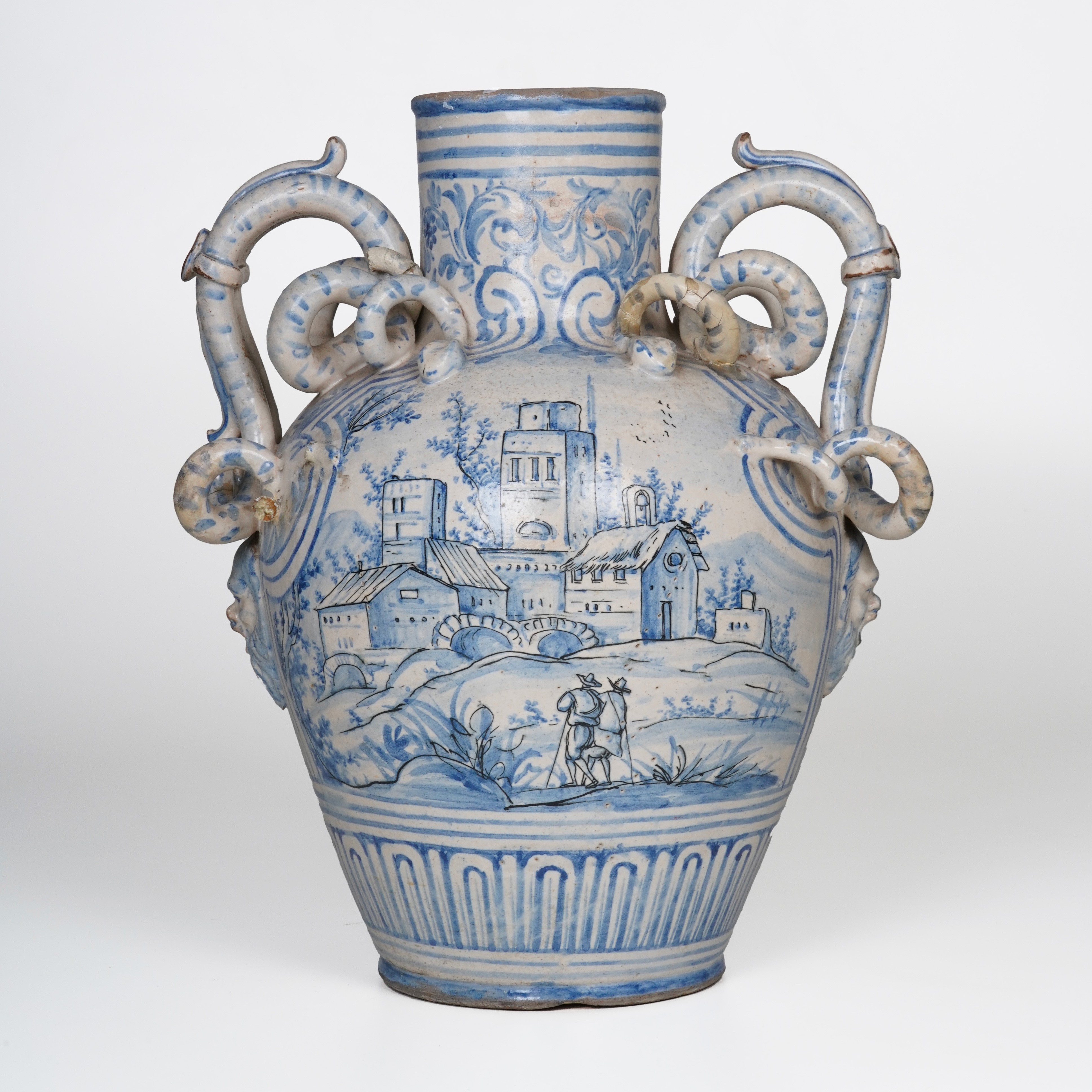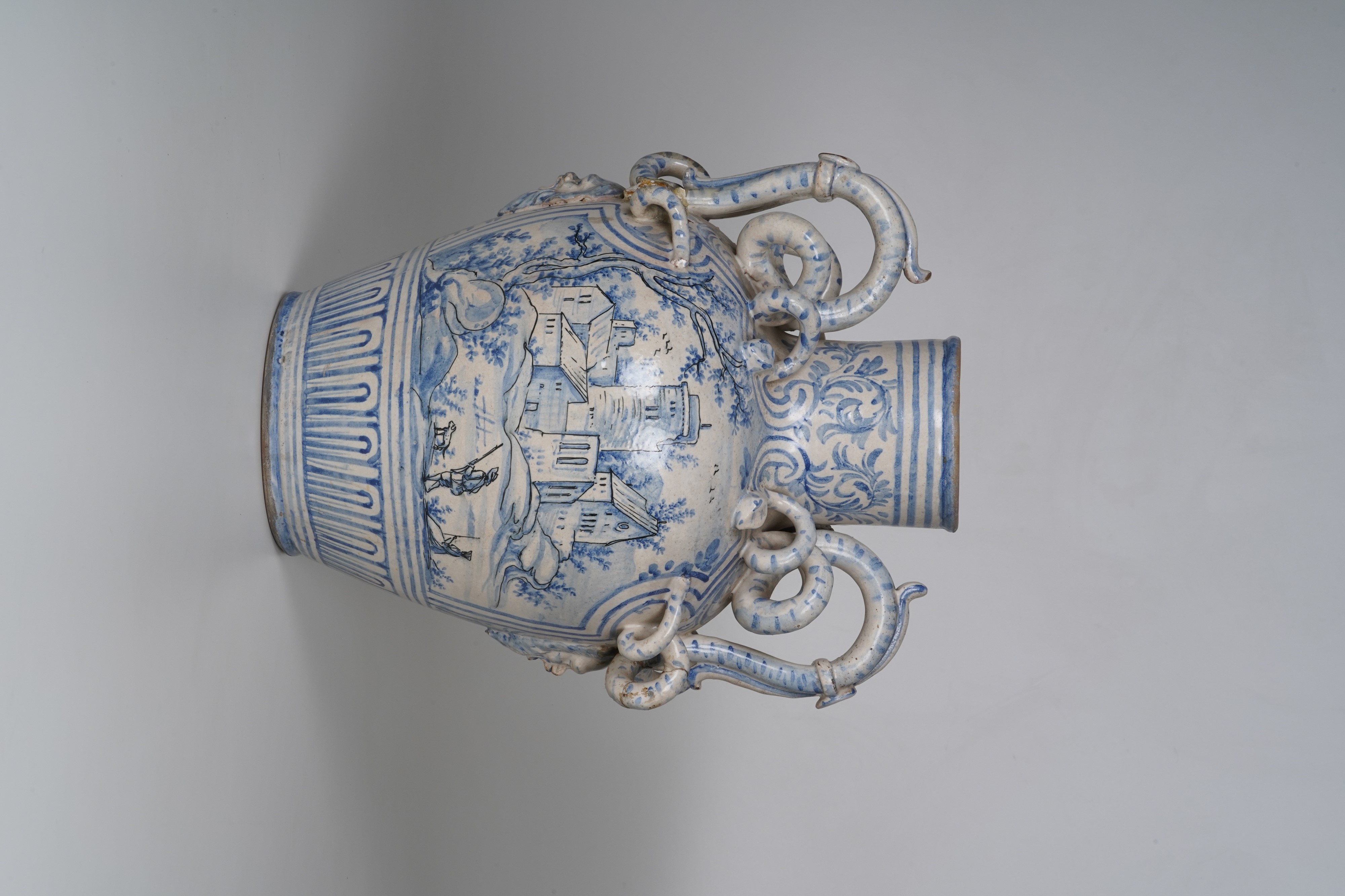 Maiolica. Marca: assente. Altezza cm 43,5. Conservazione: qualche restauro e mancanze ai serpenti dei manici.