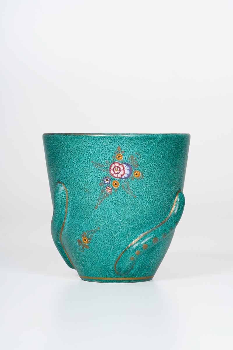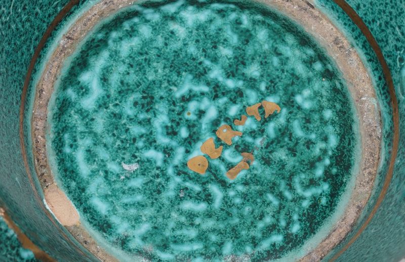 Maiolica. Marca: "Deruta" in oro. Altezza cm 15,2; diametro cm 15 circa. Conservazione: ottima; insignificanti sbeccature alla base.