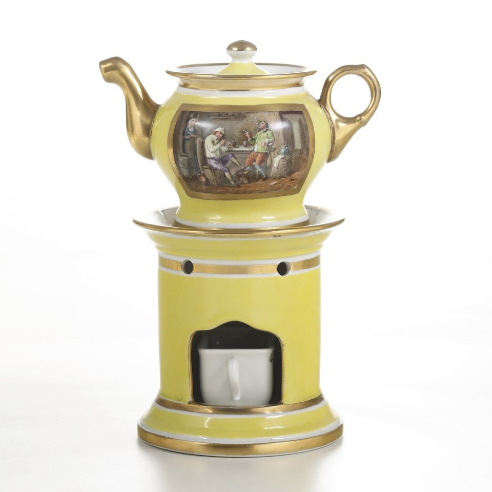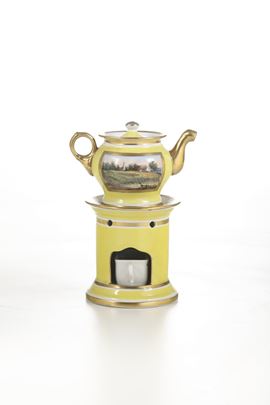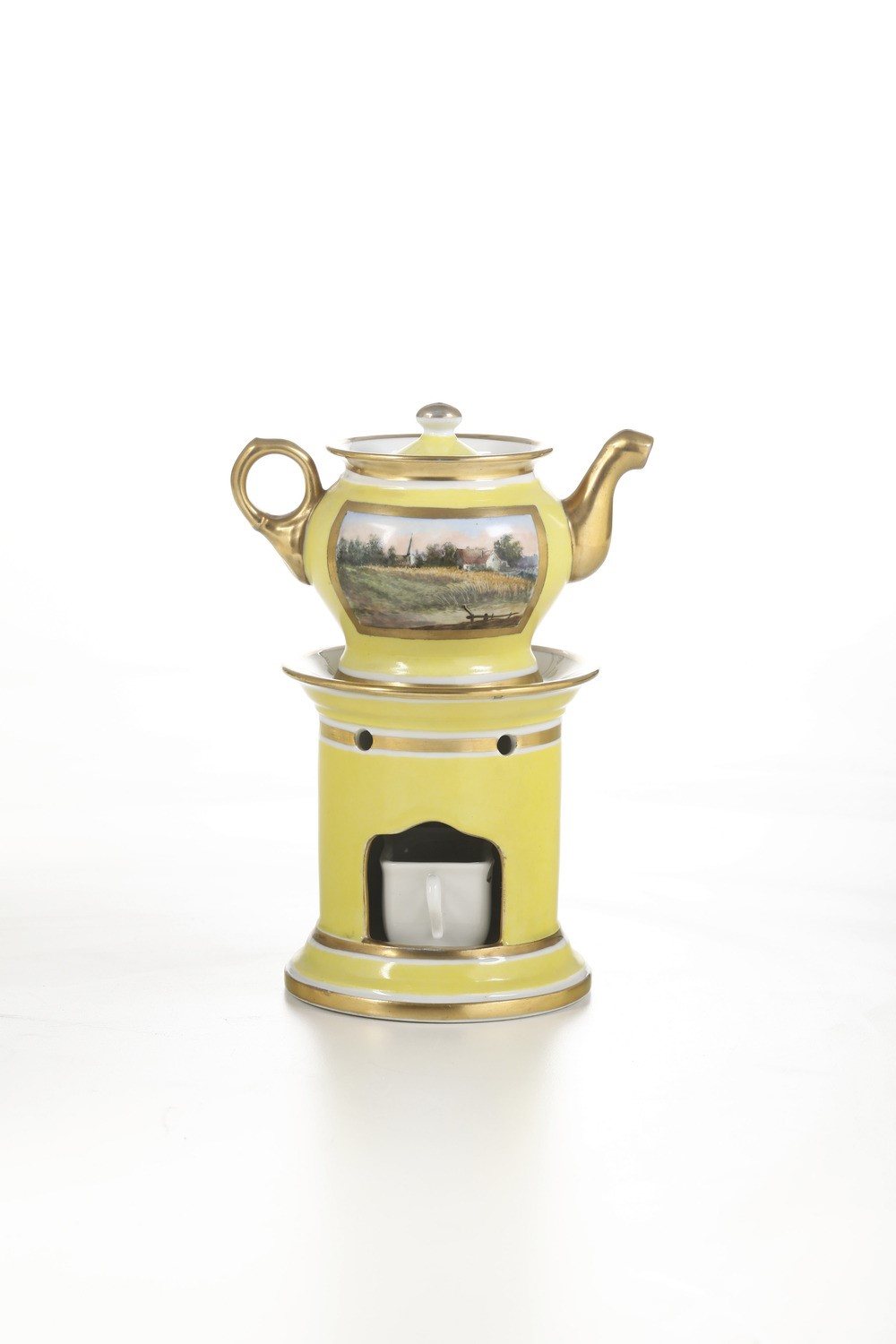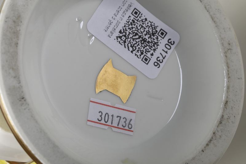 Porcellana decorata da pittore indipendente. Marca: non visibile, ricoperta in oro. Altezza totale cm 21,5. Conservazione: ottima; bacinella porta olio non pertinente, con piccola sbeccatura al bordo.