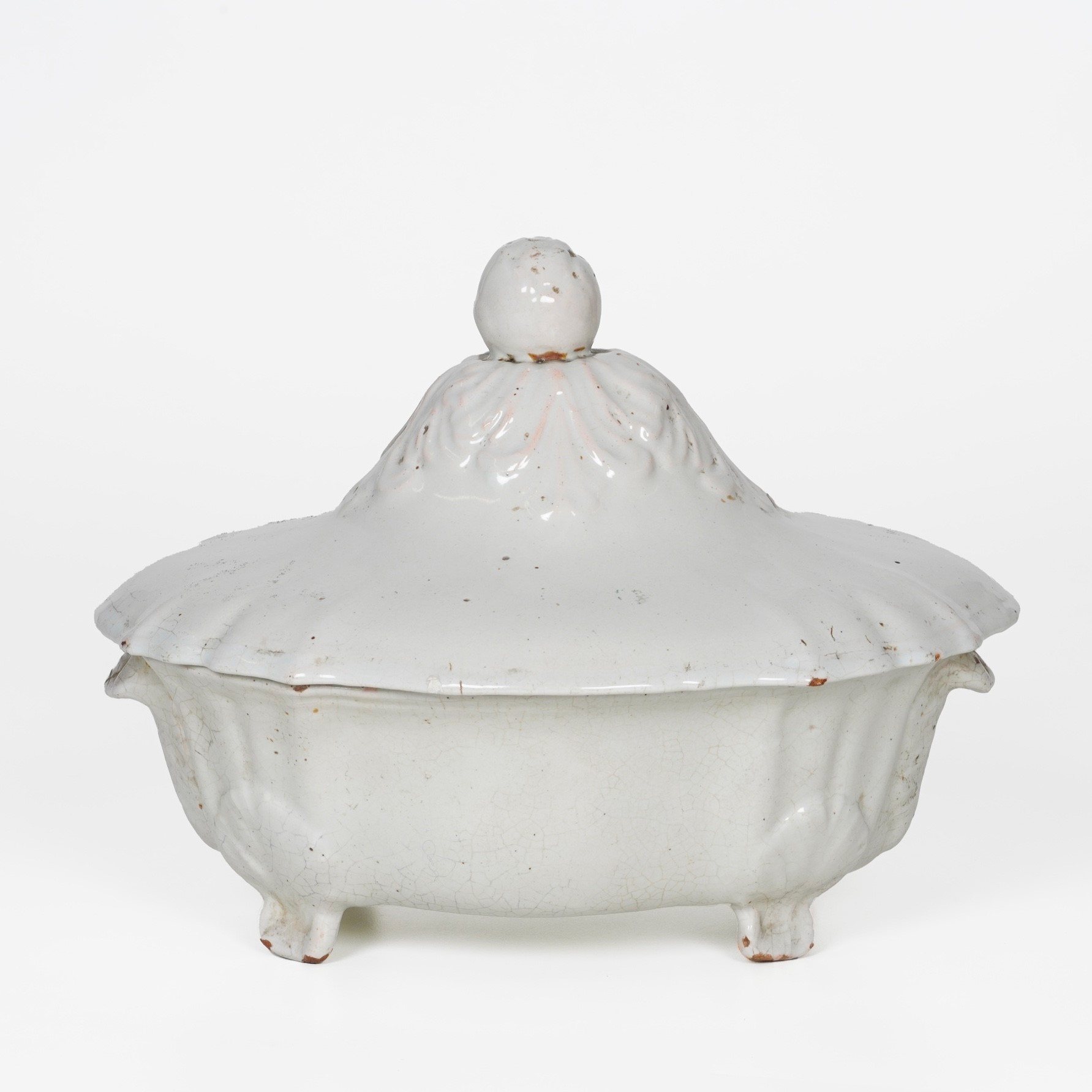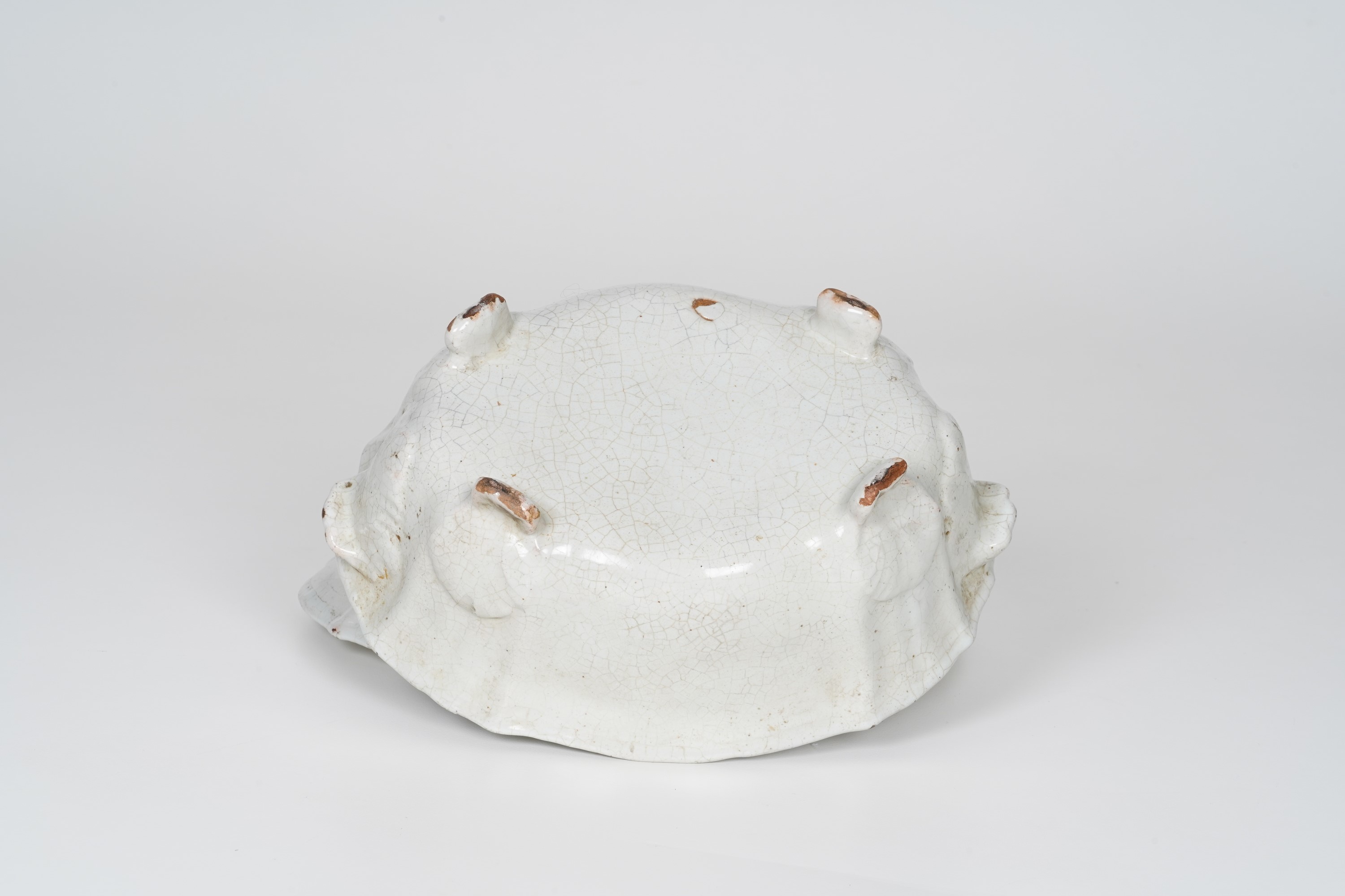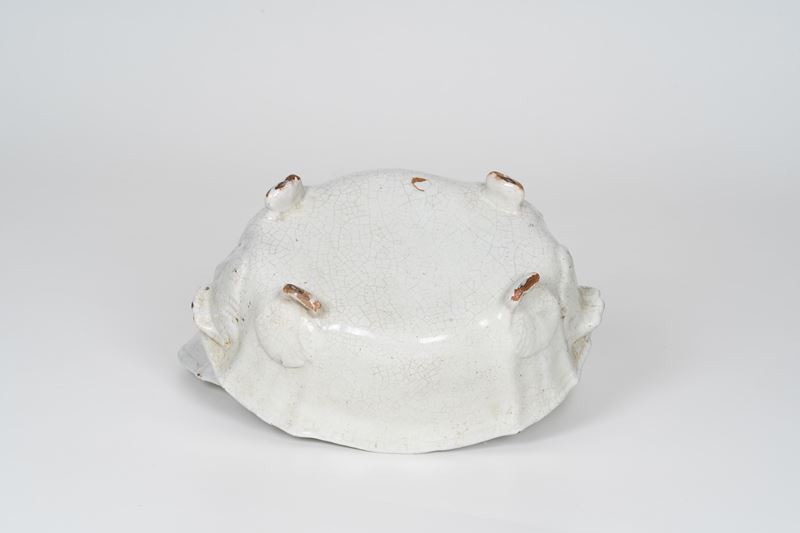 Maiolica bianca. Marca: assente. Dimensioni: altezza cm 21,5; 27x22 circa. Conservazione: buona; minime sbeccature e craquellures.