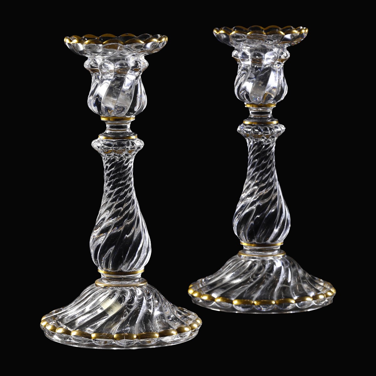 I candelieri poggiano su piede circolare a costolature attorcigliate da cui sorge il gambo a balaustro. Le bobèches sono impreziosite da una filettatura in oro al bordo