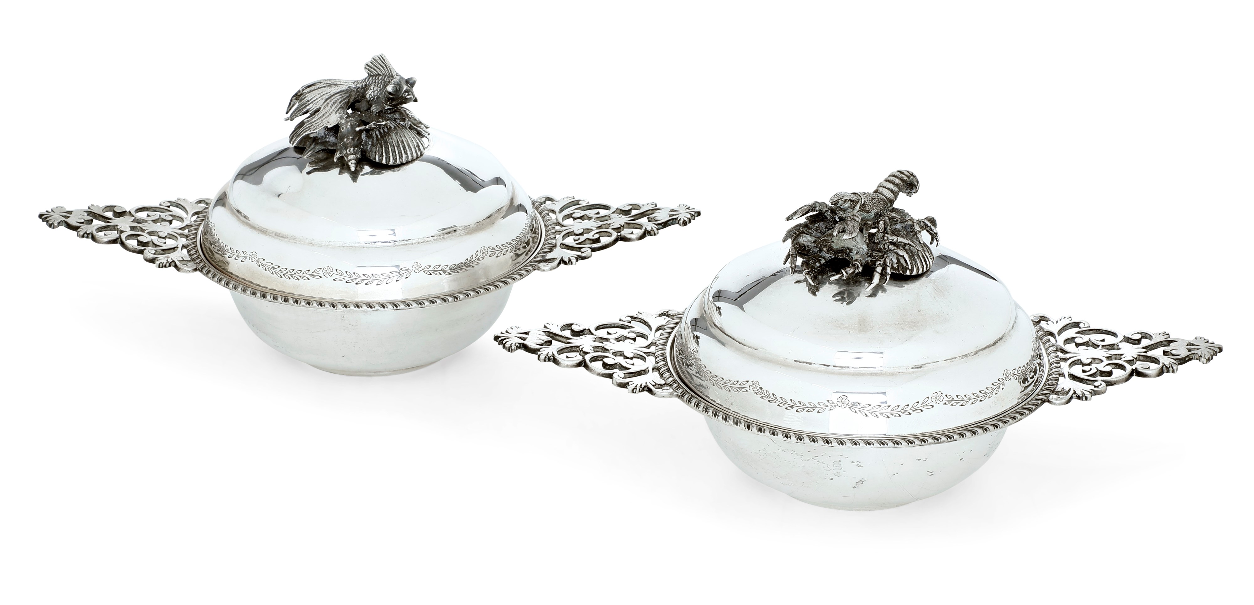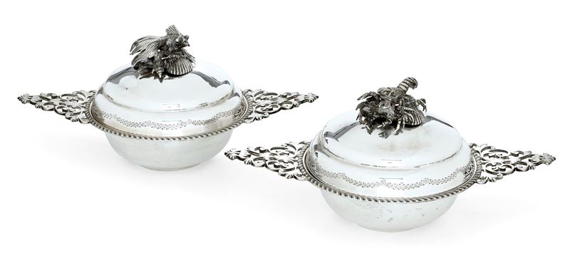 Coppia di legumiere. Sheffield 1908, argentiere Robert & Belk