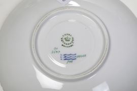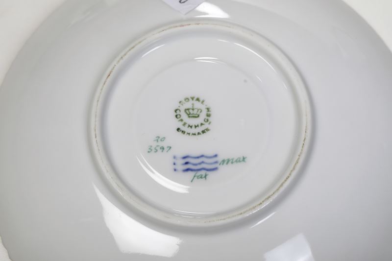 Porcellana policroma. Marca: onde in blu; "Royal Copenhagen Denmark" con corona e diversi numeri in verde. Dimensioni: altezza tazza cm 6,8; diametro piattino cm 12,8. Conservazione: ottima