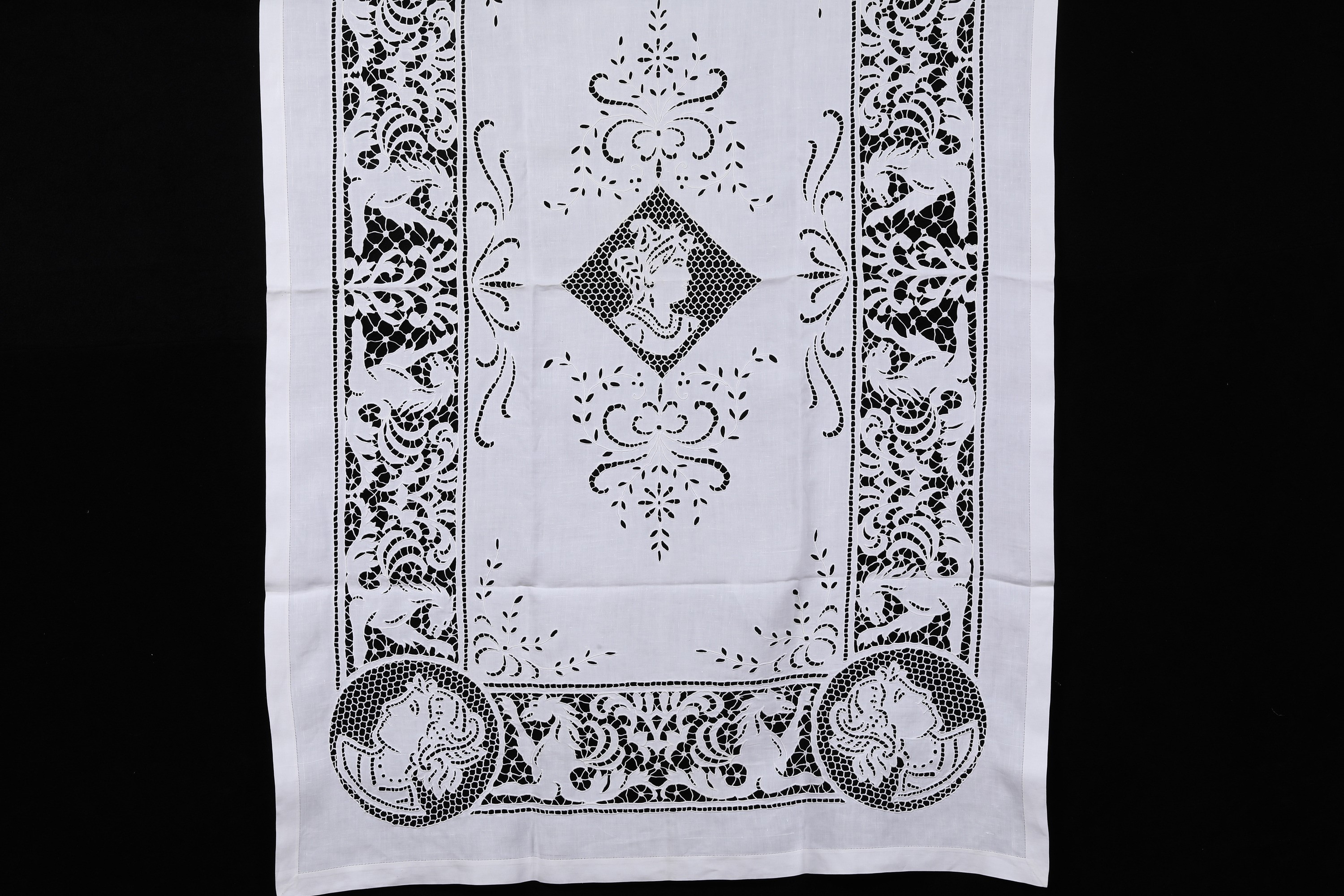 In lino bianco con una cornice in pizzo e medaglioni raffiguranti profili femminili. cm 165x108. Conservazione: ottima