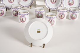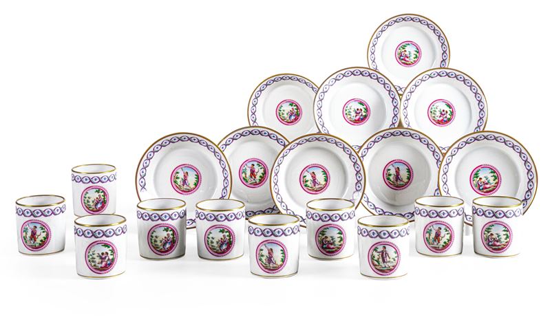 Le tazze cilindriche con il piattino troncoconico, sono decorate in policromia e oro con un medaglione al centro, animato da personaggi in un ampio paesaggio. Al bordo corrono intrecciandosi due nastri. Questo motivo decorativo è ripreso dalle porcellane prodotte dalla manifattura toscana alla fine del Settecento e ai primi dell’Ottocento