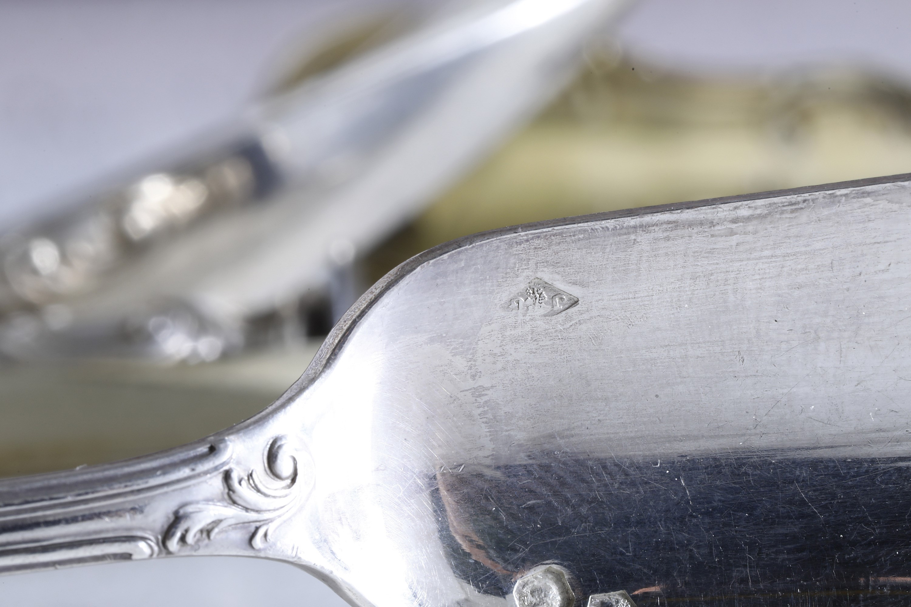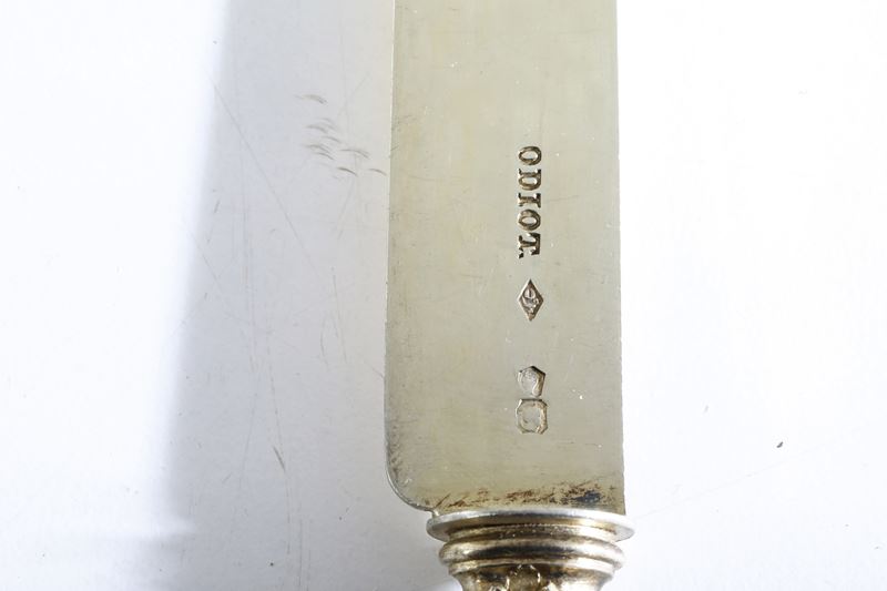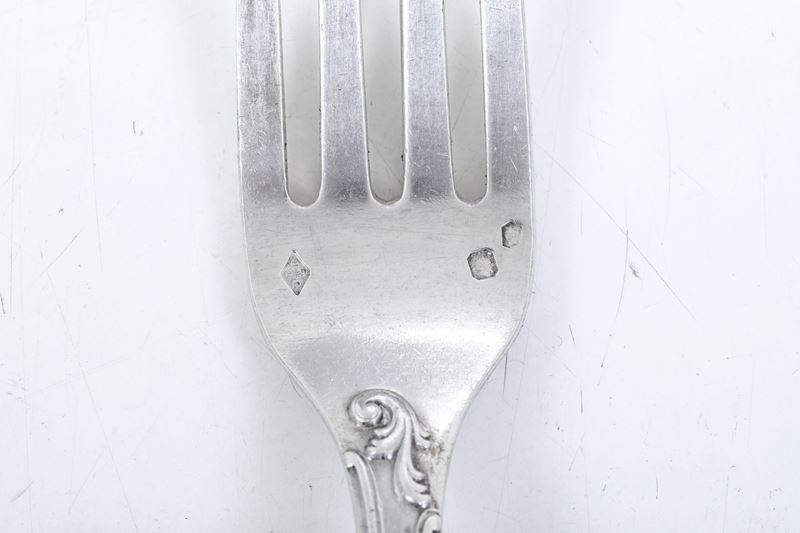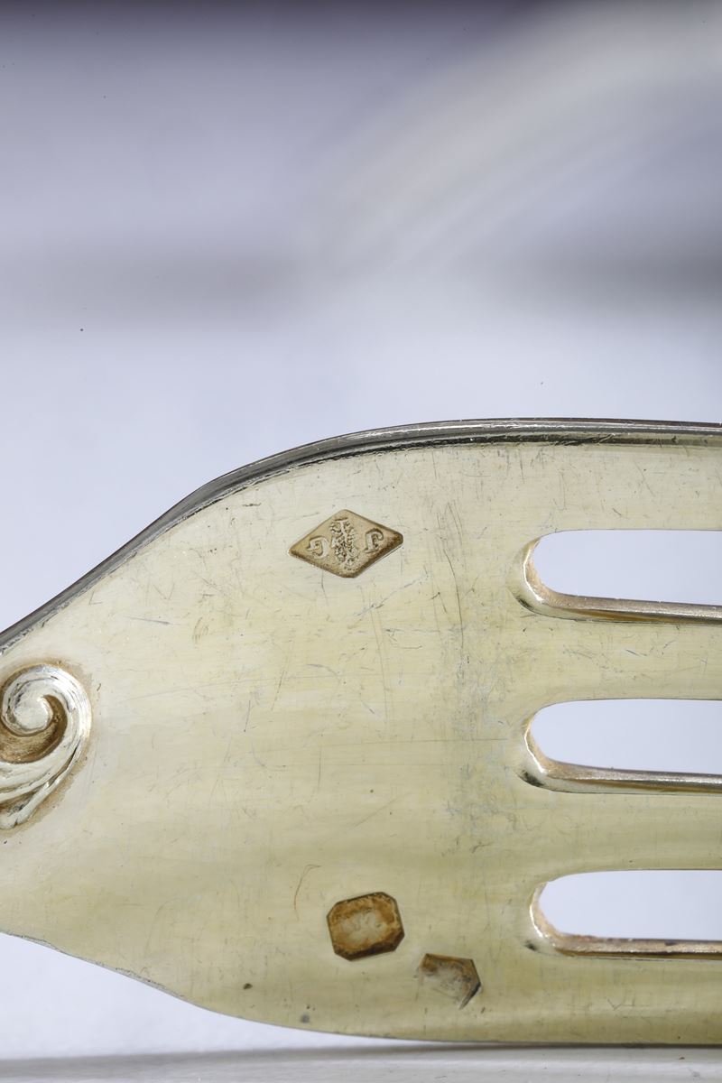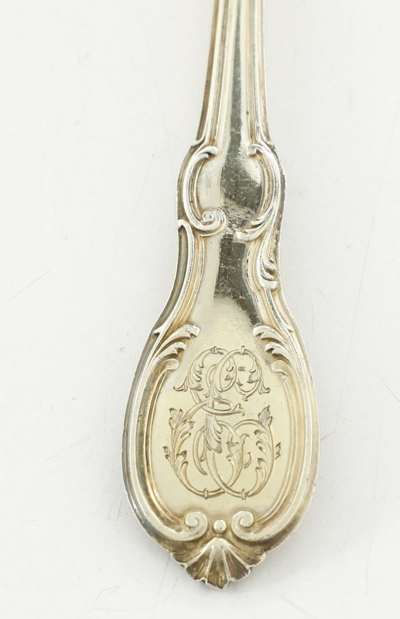 Eleganti manici sagomati con profili a volute e conchiglie di gusto rocaille. Entro riserva monogramma EC finemente cesellato.