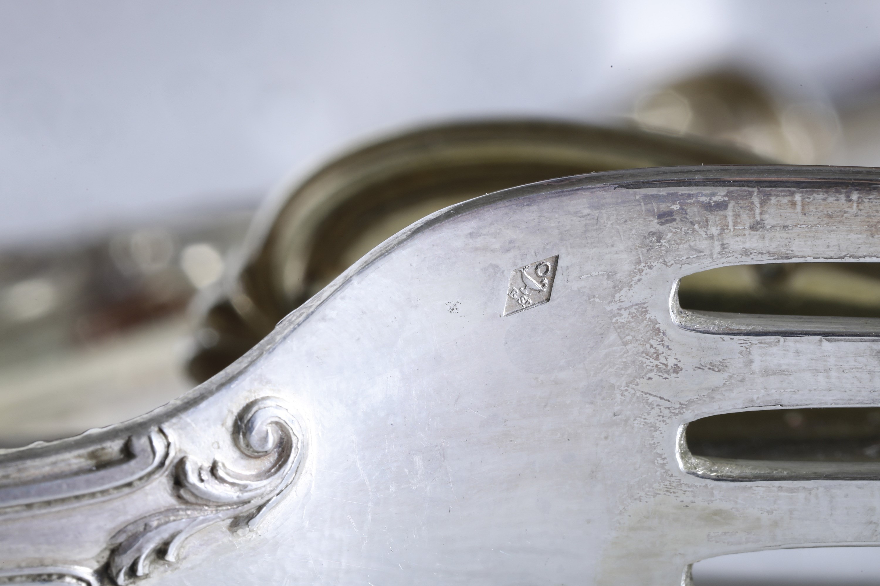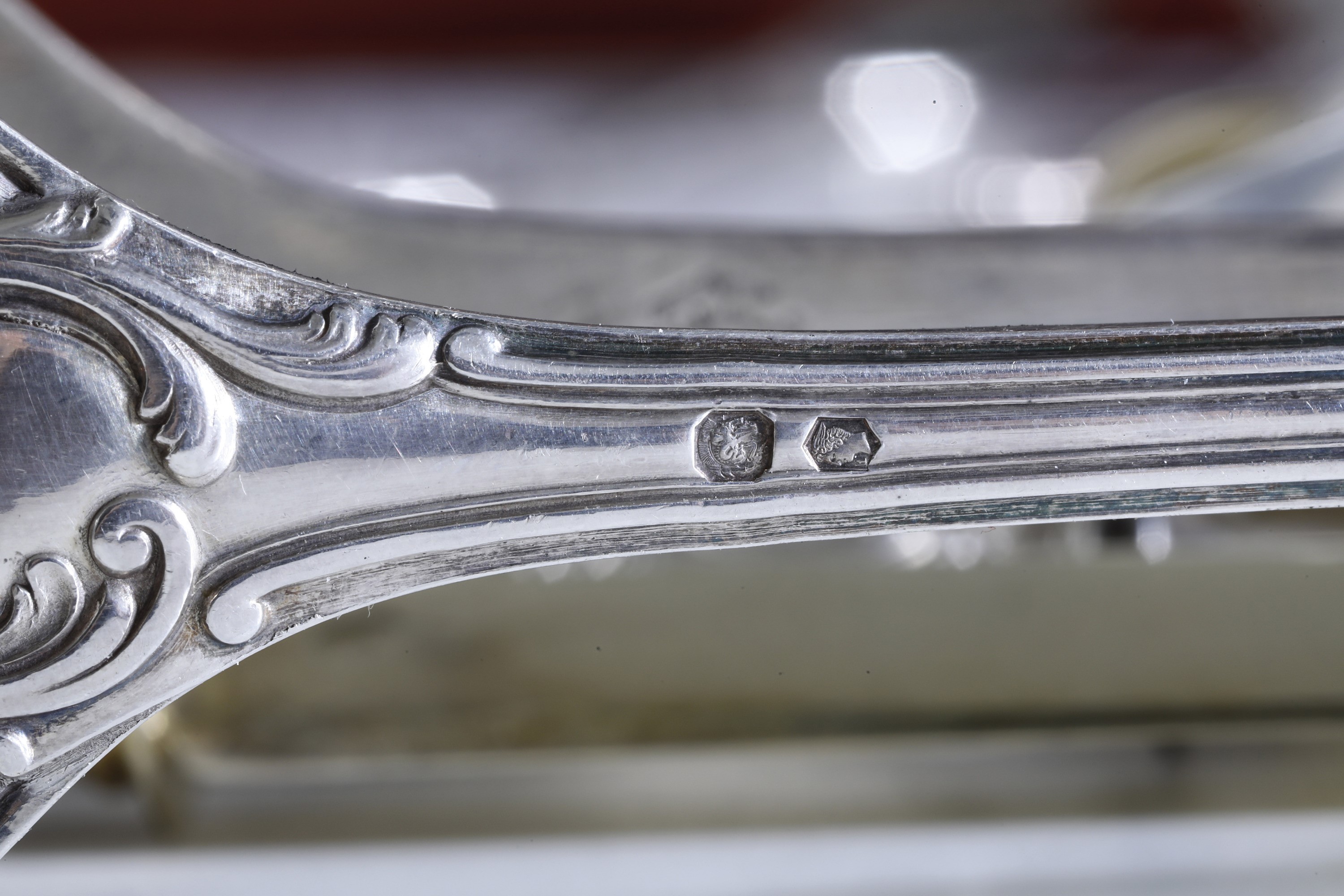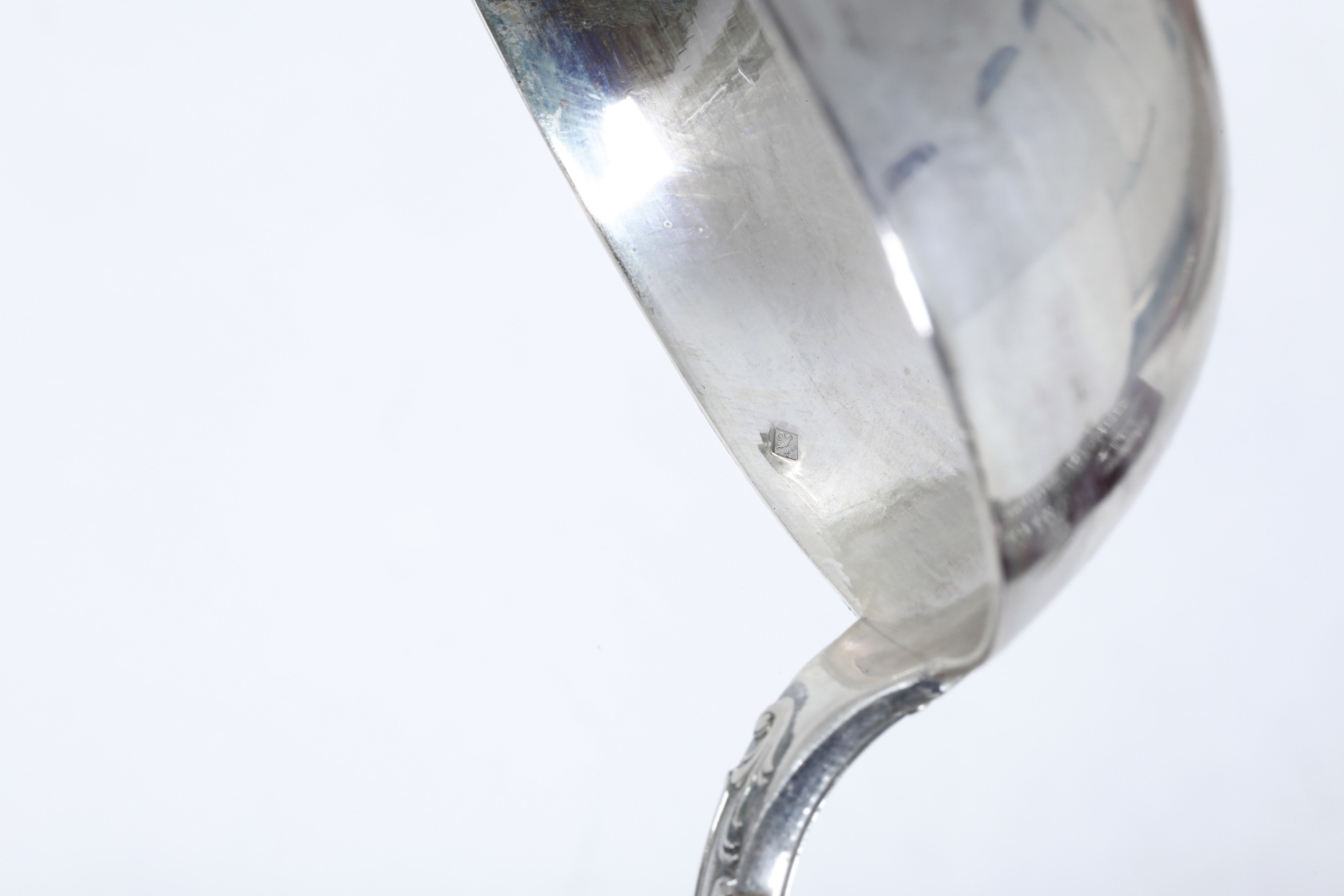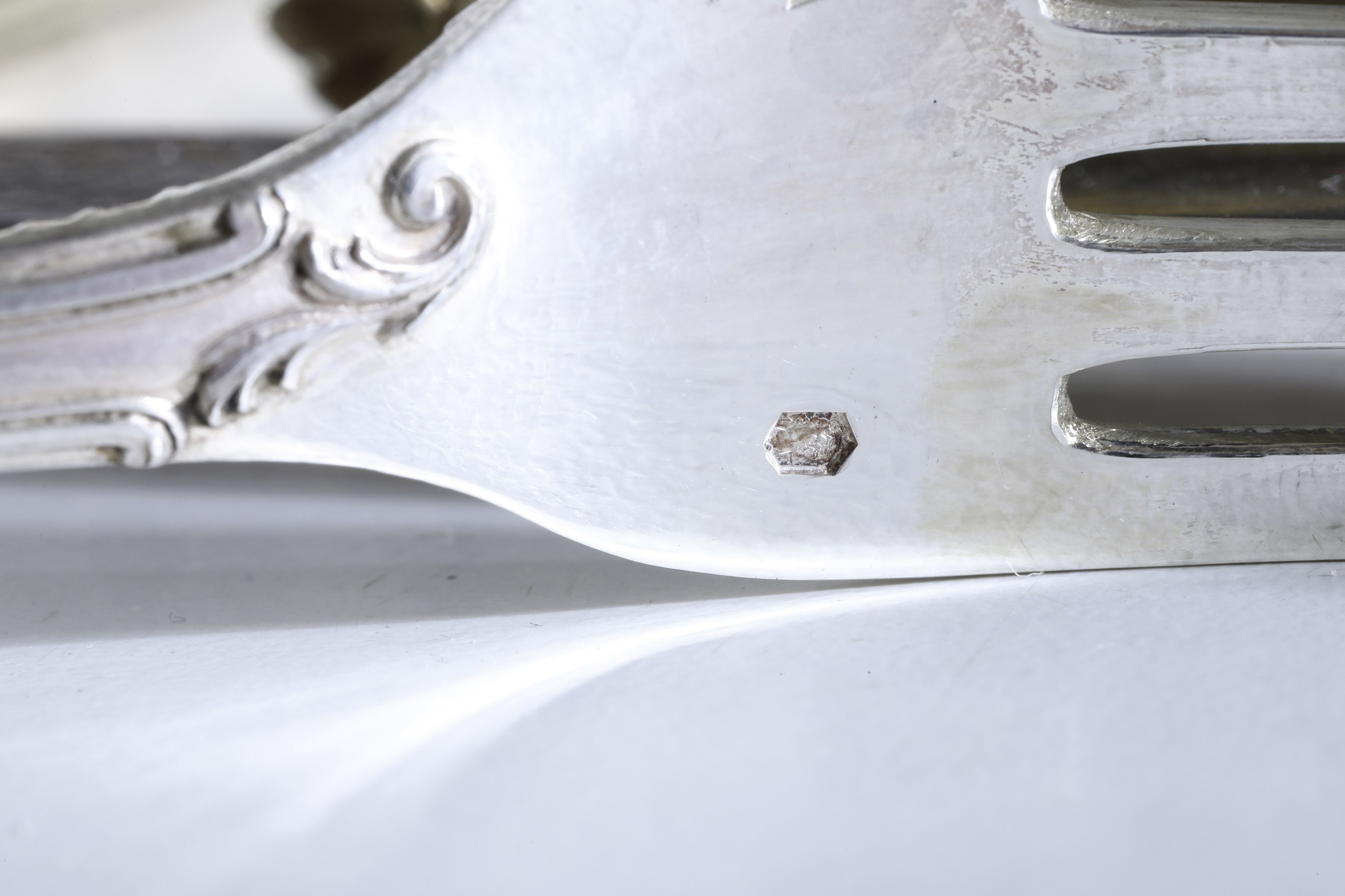 Eleganti manici sagomati con profili a volute e conchiglie di gusto rocaille. Entro riserva monogramma EC finemente cesellato.