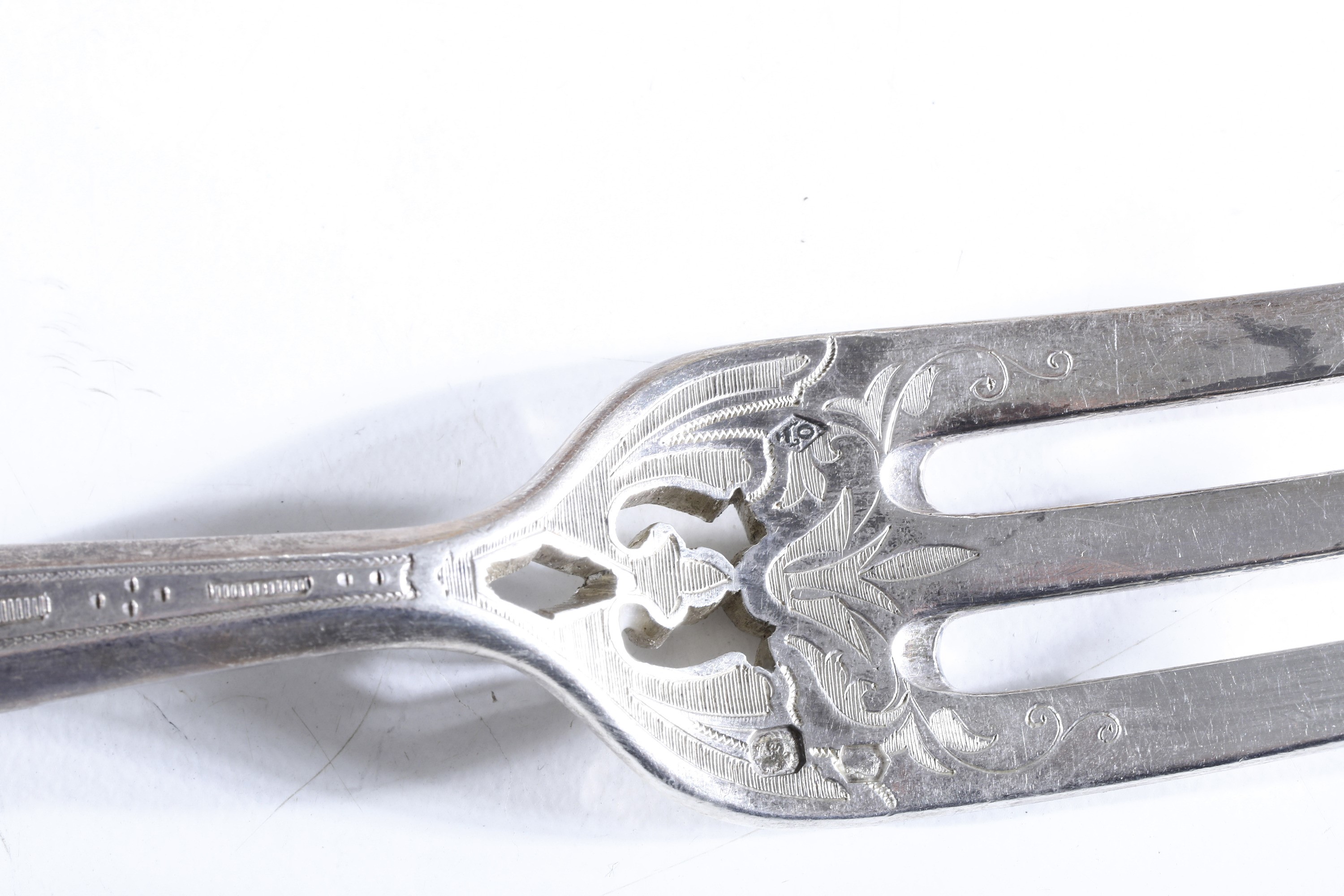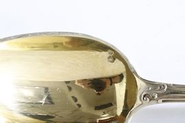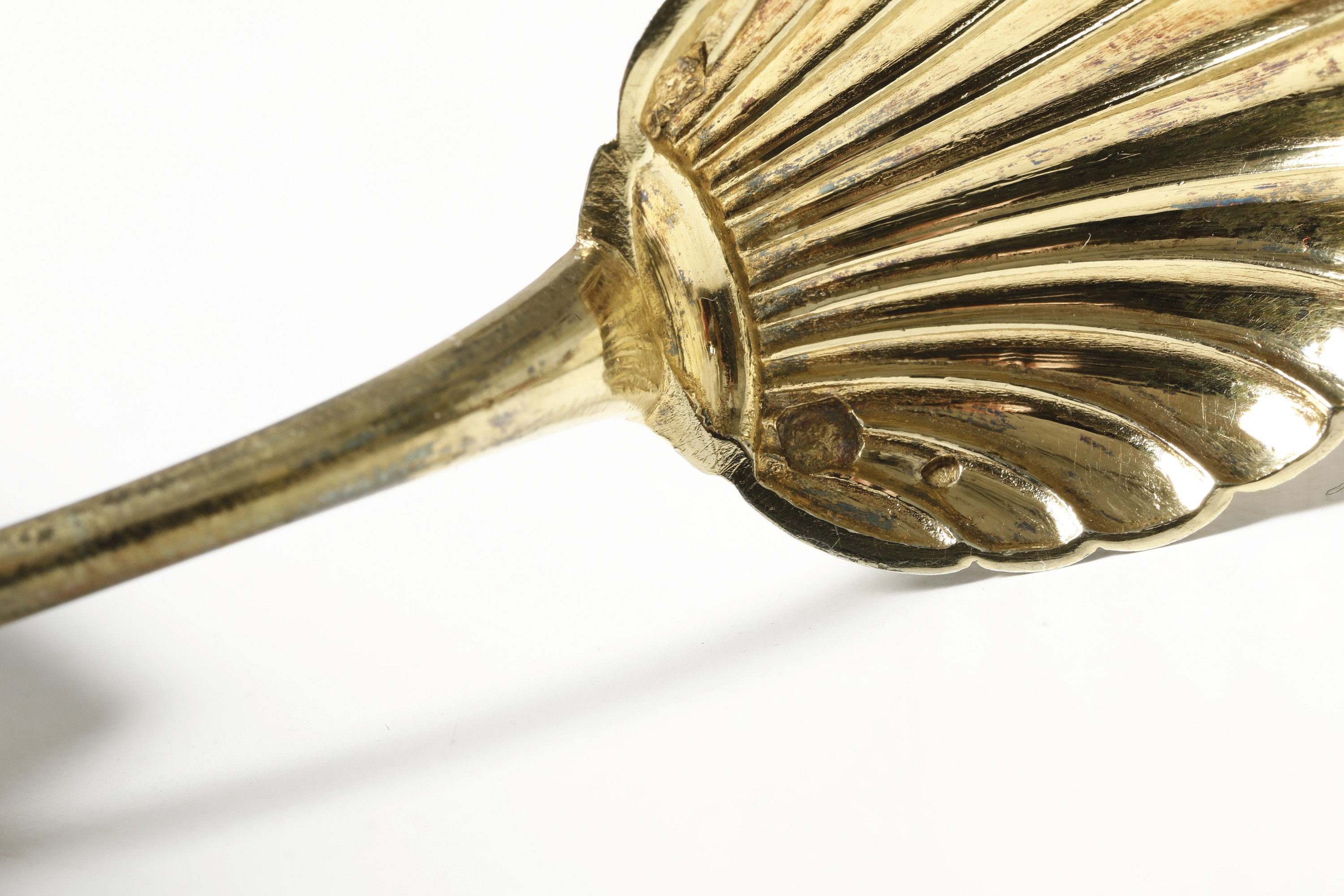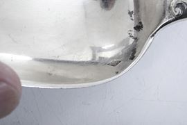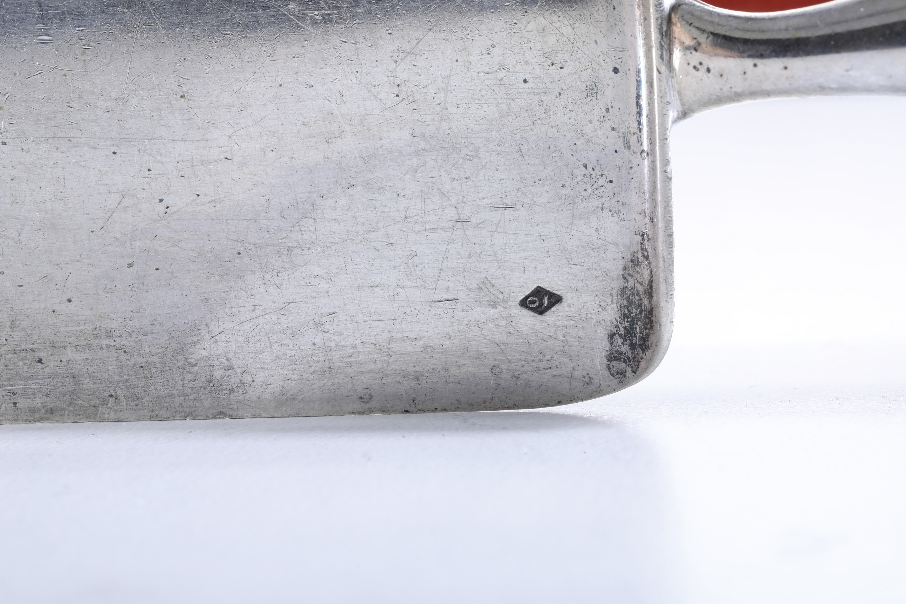 Eleganti manici sagomati con profili a volute e conchiglie di gusto rocaille. Entro riserva monogramma EC finemente cesellato.