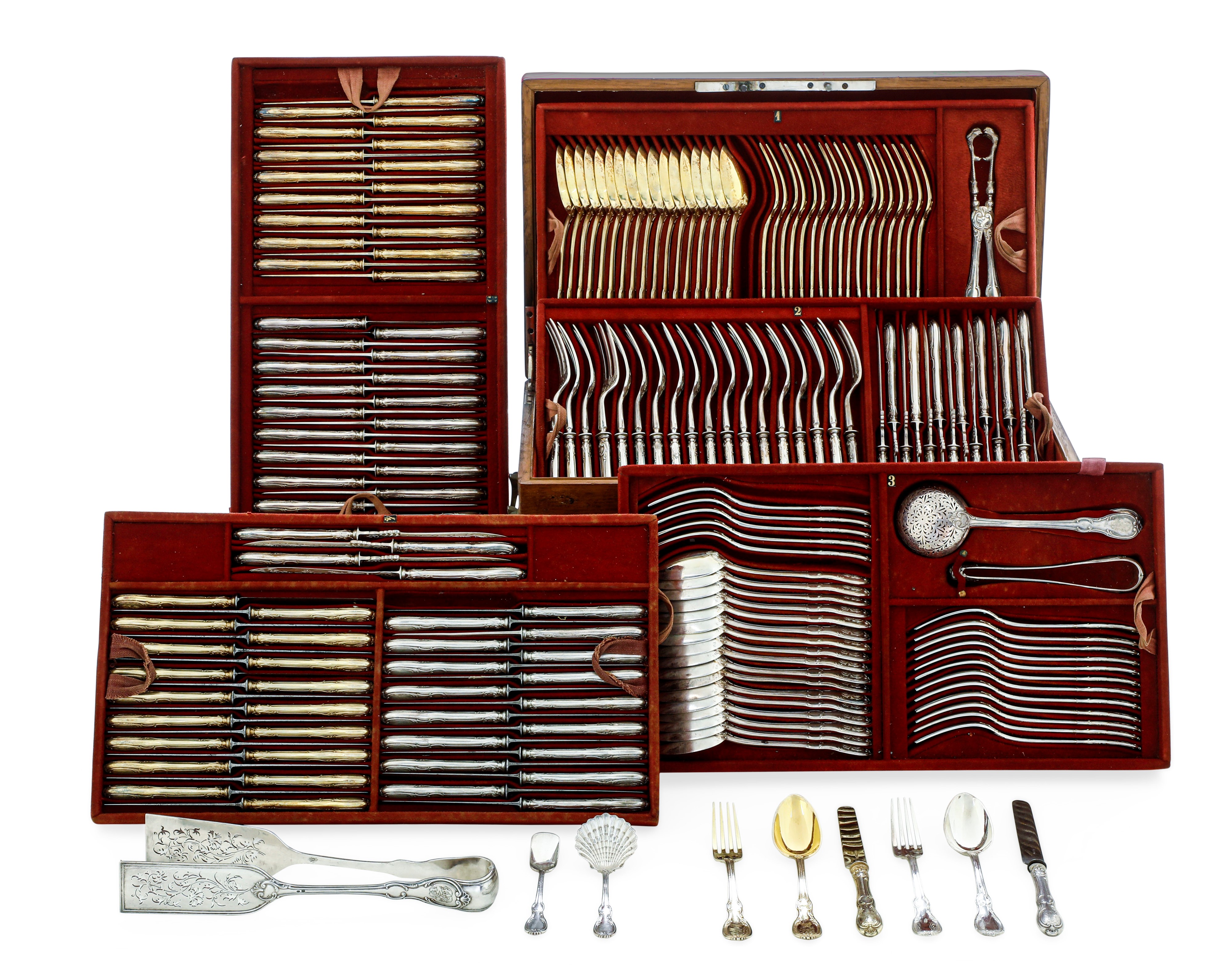 La seconda cassetta contiene 60 forchette e 18 cucchiai grandi a firma J.G.,60 coltelli grandi Odiot, 9 posate da portata Odiot (il mestolo non è coevo al resto) e 12 cucchiaini a conchiglia dorati Odiot.