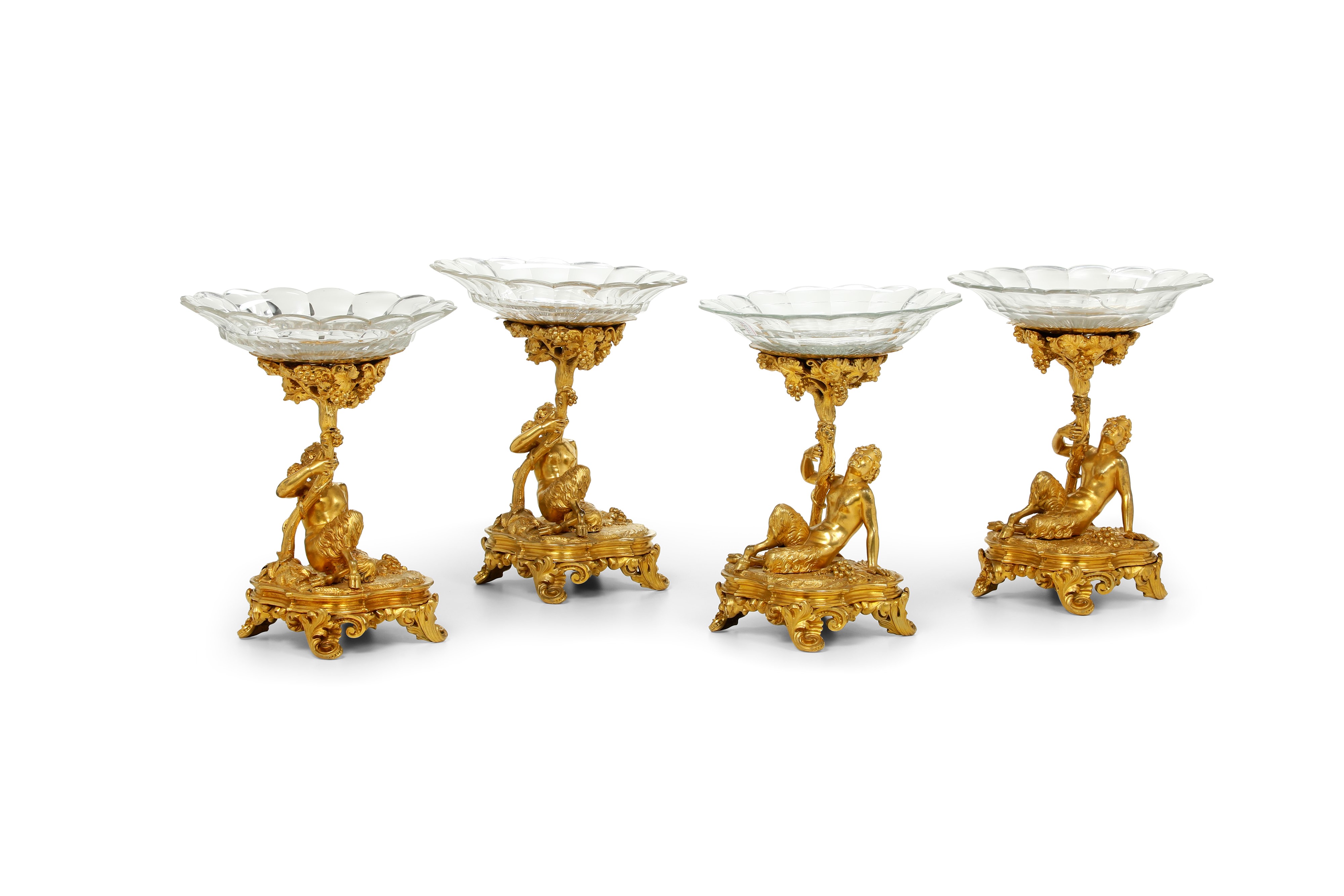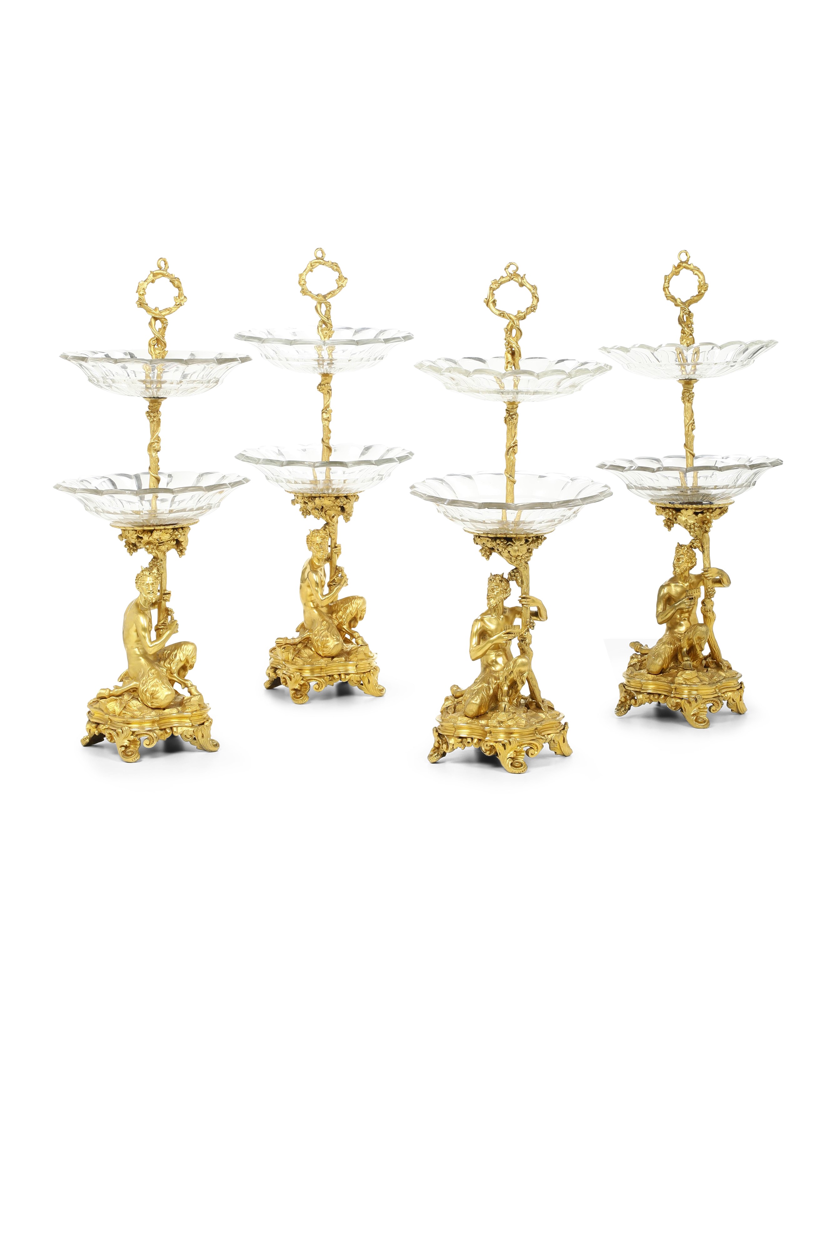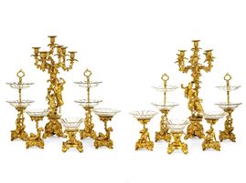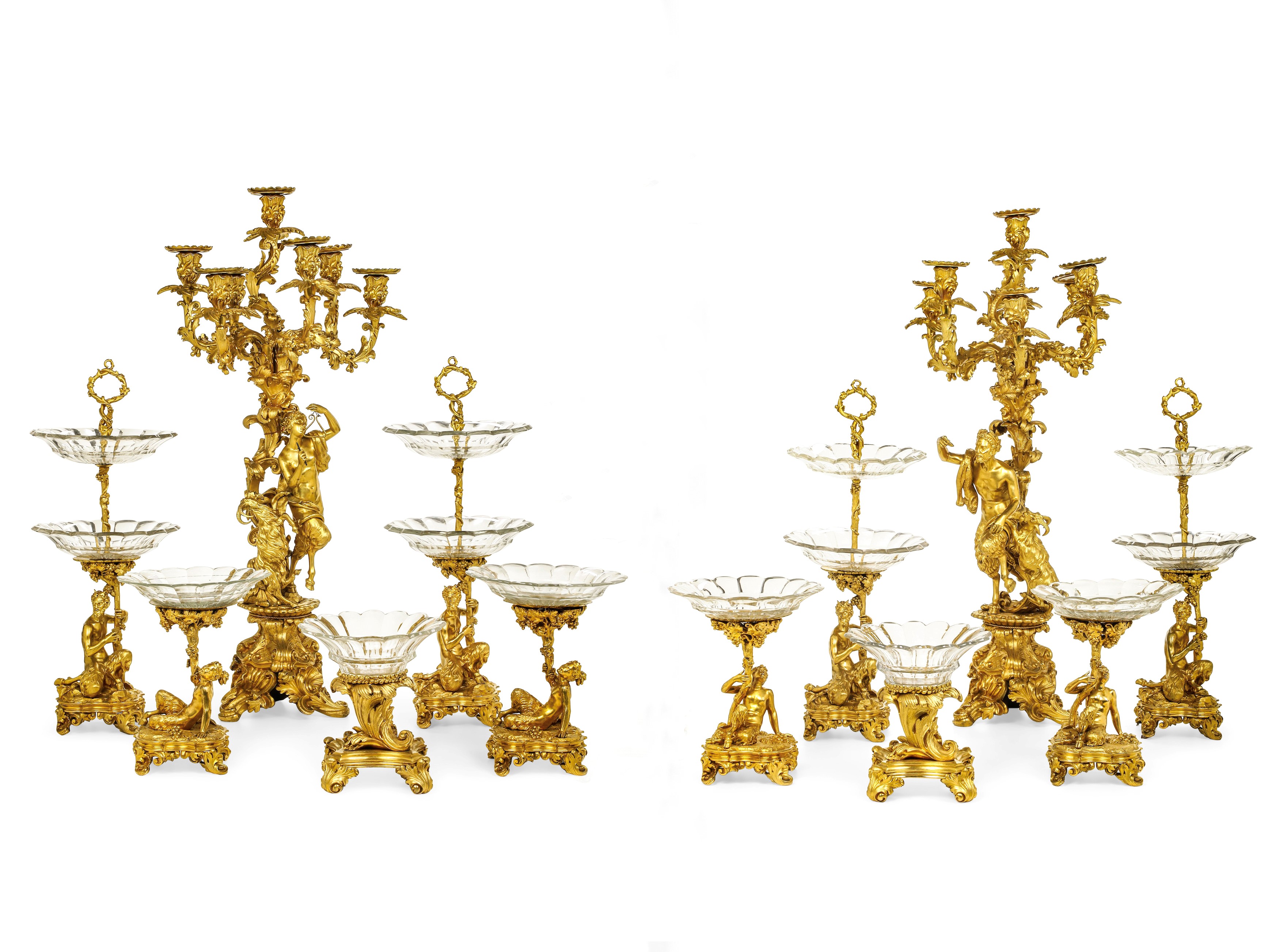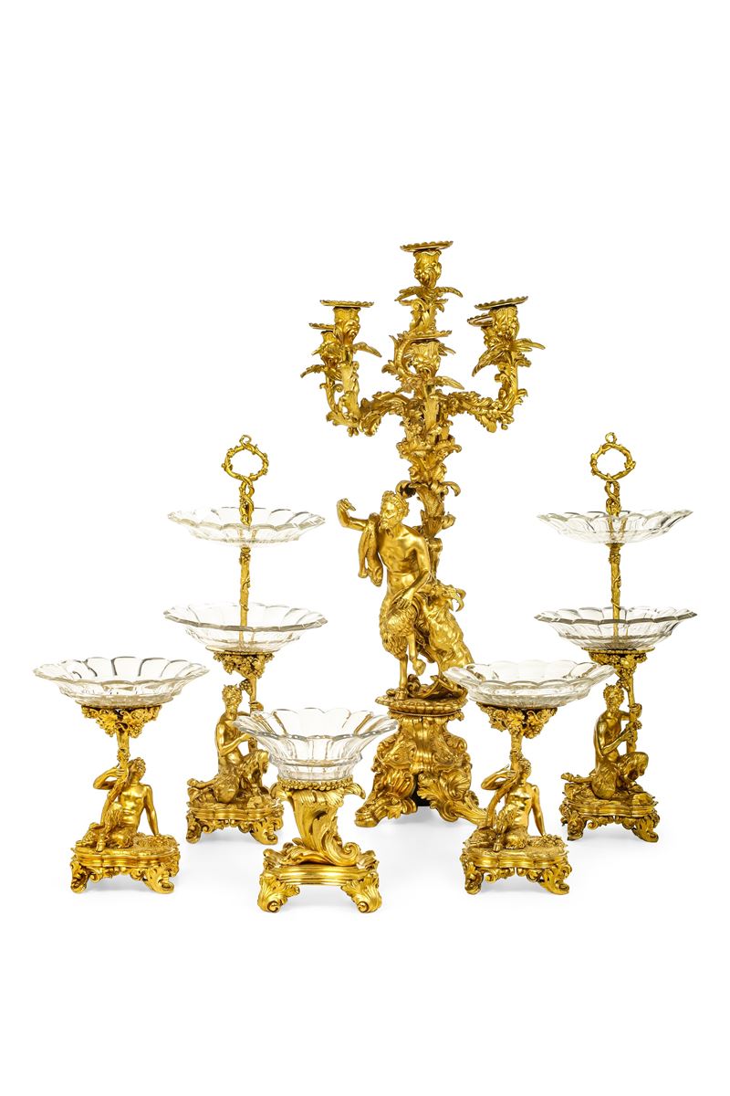 composto da una grande alzata con conchiglia sorretta da putti e coralli marini, due candelabri a sette fiamme, quattro alzate a due ripiani in cristallo molato, quattro alzate a un ripiano in cristallo molato con raffigurazioni di satiri e satiresse e tralci di vite e due alzate a un ripiano con coppe in cristallo molato e sostegni a cornucopie fogliacee.