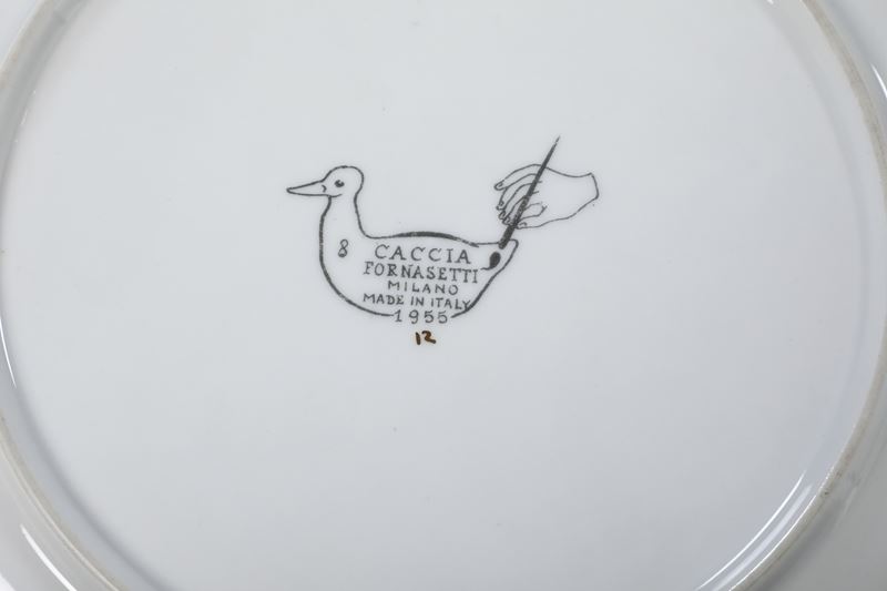 Porcellana. Marca: “Caccia Fornasetti Milano Made in Italy 1955” in nero. Diametro cm 26. Conservazione ottima