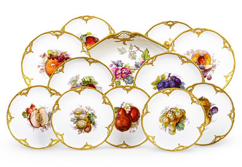 Il raffinato servizio è dipinto in policromia al centro dei piatti con diverse composizioni di frutta, mentre le fruttiere ospitano un mazzo di fiori, al bordo decorazione a rocailles in oro